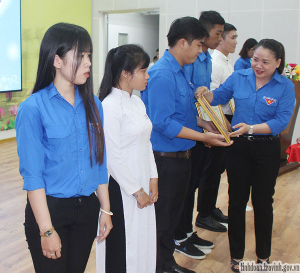 Chị Huỳnh Thị Hằng Nga trao bằng khen cho Nguyễn Thành Gia tại buổi tuyên dường học sinh, sinh viên có thành tích xuất sắc trong hoạt động Đoàn, Hội nhân kỷ niệm 69 năm ngày truyền thống học sinh, sinh viên. Ảnh: NX
