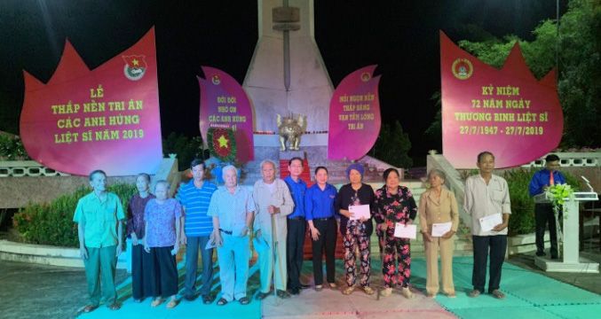 Lãnh đạo Tỉnh đoàn và Sở Lao động TB&XH tặng quà cho gia đình chính sách huyện Càng Long Năm 2019 là năm thứ 10 triển khai tổ chức Lễ Thắp nến tri ân trên địa bàn tỉnh. Đây là dịp để tuổi trẻ Trà Vinh hôm nay bày tỏ lòng biết ơn sâu sắc tới những anh hùng liệt sỹ, các mẹ Việt Nam anh hùng, thương bệnh binh đã hy sinh cho cách mạng. Nhận thức được trách nhiệm và nghĩa vụ của mình, trong thời gian qua tuổi trẻ tỉnh nhà không ngừng phát huy truyền thống cách mạng, tích cực tham gia thực hiện tốt chính sách đền ơn, đáp nghĩa, uống nước nhớ nguồn với nhiều hoạt động giáo dục lý tưởng cách mạng, truyền thống yêu nước cho thanh thiếu nhi thông qua đợt sinh hoạt chính trị với chủ đề “Theo bước chân những người anh hùng”, các diễn đàn, tọa đàm, sinh hoạt truyền thống, hành trình đến với địa chỉ đỏ, tuyên truyền các tấm gương anh hùng trẻ tuổi trong kháng chiến và trong giai đoạn hiện nay; các hoạt động kỷ niệm 50 năm thực hiện Di chúc Chủ tịch Hồ Chí Minh; nhiều chương trình, hoạt động, công trình, phần việc thiết thực, cụ thể trong chăm lo, giúp đỡ gia đình liệt sỹ, Mẹ Việt Nam anh hùng, gia đình thương binh, bệnh binh, cựu thanh niên xung phong, người có công với cách mạng và người dân có hoàn cảnh khó khăn trên địa bàn như: tu chỉnh nghĩa trang, nhà bia ghi danh liệt sỹ, tổ chức khám chữa bệnh cấp phát thuốc miễn phí, phát động phong trào áo lụa tặng bà, nhận phụng dưỡng Mẹ Việt Nam anh hùng, xây dựng nhà tình nghĩa cho gia đình chính sách, xây nhà tình nghĩa, tổ chức các hoạt động chăm sóc cựu thanh niên xung phong,…