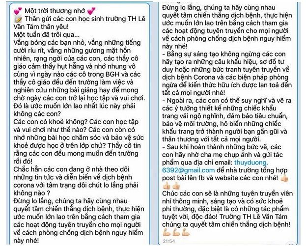 Ngày 6/2, sau một tuần học sinh không đến trường vì dịch bệnh Covid-19 diễn biến phức tạp, Ban Giám hiệu trường tiểu học Lê Văn Tám (Hai Bà Trưng, Hà Nội) đã có thư gửi cho học sinh toàn trường thể hiện nỗi nhớ nhung học trò của các thầy cô và đặc biệt không quên nhiệm vụ tuyên truyền, thực hiện phòng chống bệnh dịch.
