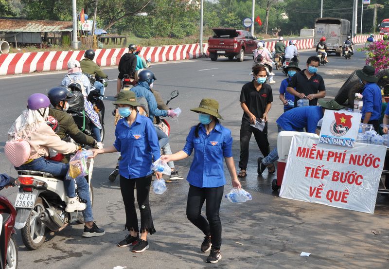 Hàng ngàn người dân các tỉnh khu vực Tây Nguyên về quê ăn tết ngang qua địa bàn xã Tân Lập, huyện Đồng Phú cảm thấy ấm lòng khi được các đoàn viên, thanh niên phát nước suối, khăn lạnh và khẩu trang miễn phí.