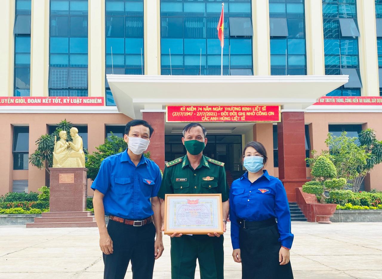 Đồng chí Trương Tấn Hùng – Phó Bí thư thường trực Tỉnh đoàn trao tặng bằng khen cho đại diện Bộ Chỉ huy Bộ đội Biên phòng tỉnh để chuyển tới hai em Quốc Bảo và Hữu Bảo đang trong khu vực phong toả