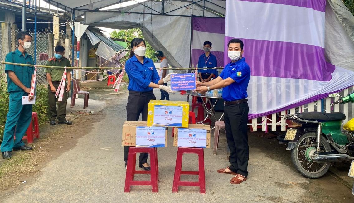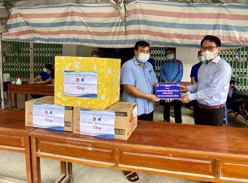 Đồng chí Võ Minh Nhựt, Phó Bí thư Thường trực, Chủ tịch Hội LHTN tỉnh trao quà cho lực lượng làm nhiệm vụ trên địa bàn huyện Trà Cú