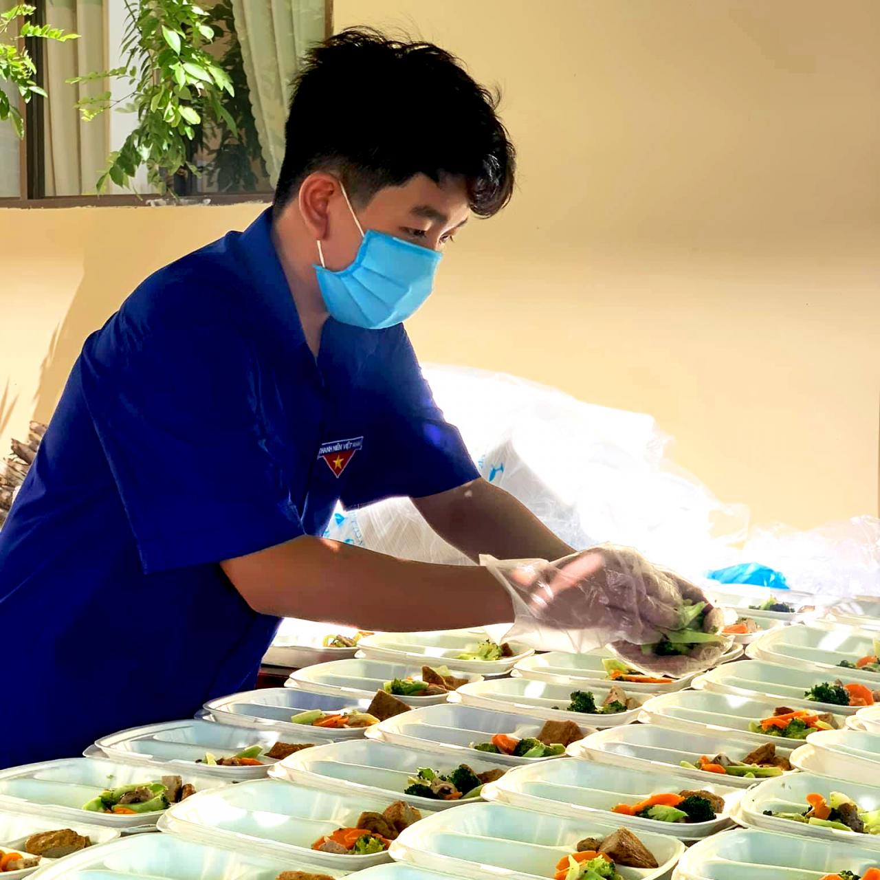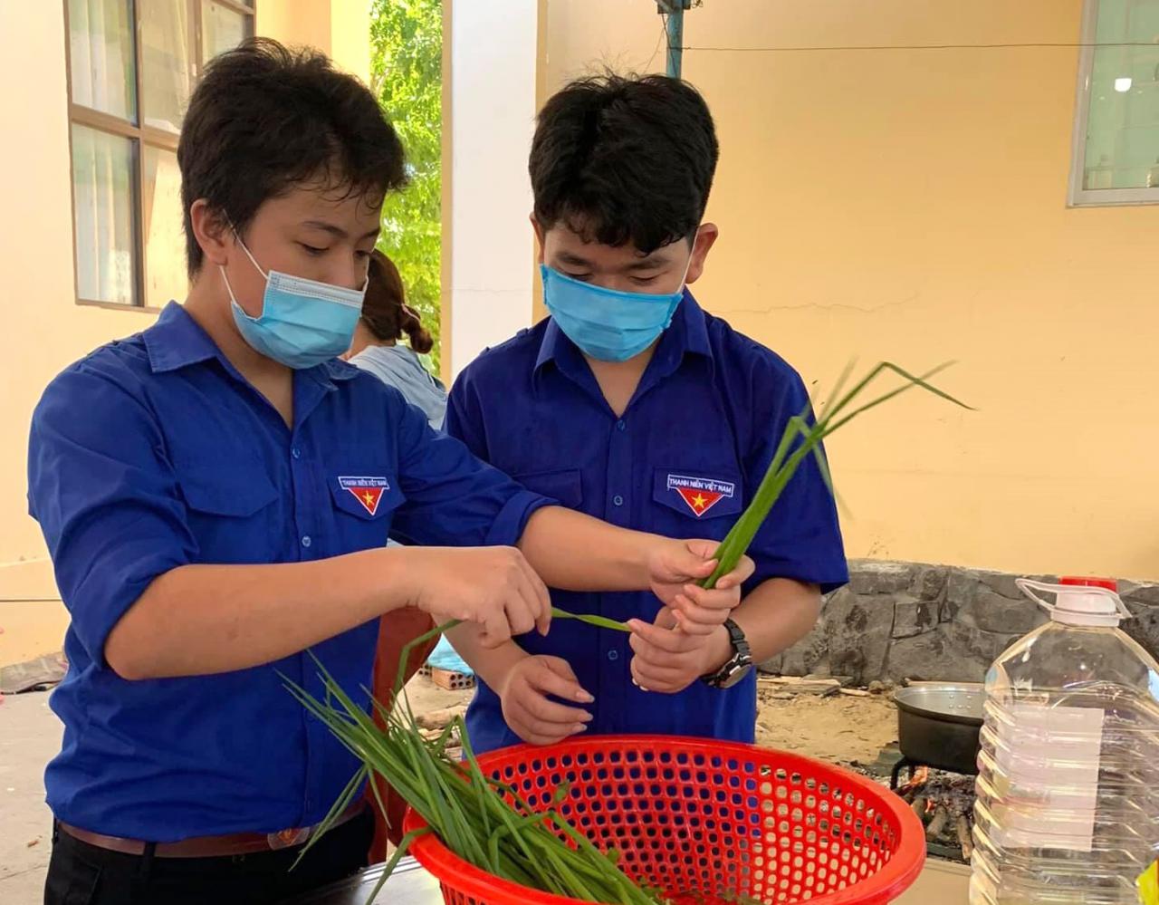 Công việc hằng ngày của các em là phụ giúp các bác, các anh chị nhặt rau, rửa rau, làm mắm, bưng thức ăn, cho cơm và thức ăn vào hộp… Em Huỳnh Ngọc Ánh Quốc nhỏ tuổi nhất trong nhóm, chỉ mới 12 tuổi, nhưng thạo việc không kém gì các anh lớn tuổi. Quốc bảo nghỉ hè gặp đúng thời điểm dịch bệnh bùng phát nên chỉ biết ở nhà. Khi nghe thông tin các anh chị Đoàn xã kêu gọi tình nguyện viên, em nảy sinh ý định xin vào phụ giúp các bác, các anh chị nấu ăn giúp người cách ly tập trung có những bữa ăn ngon.