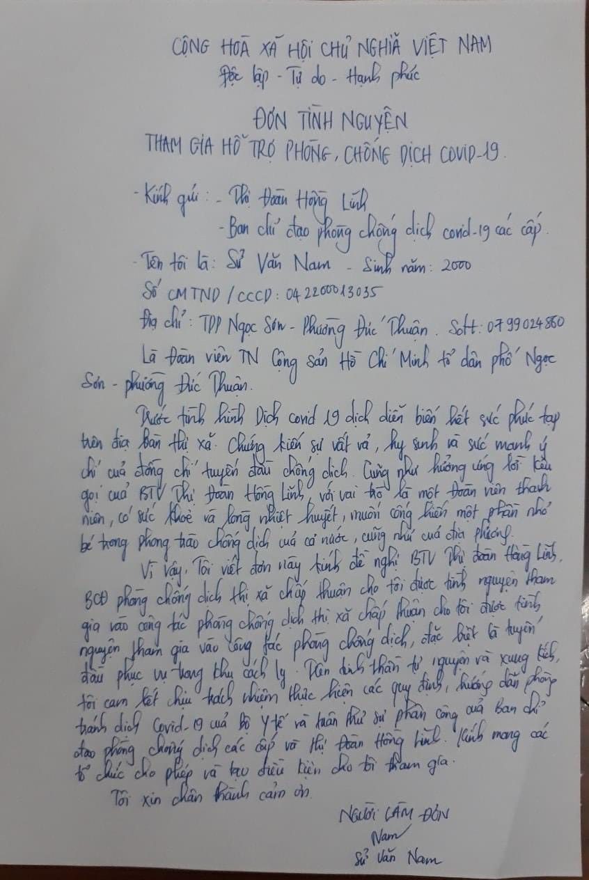 Lá đơn tình nguyện tham gia chống dịch của ĐVTN