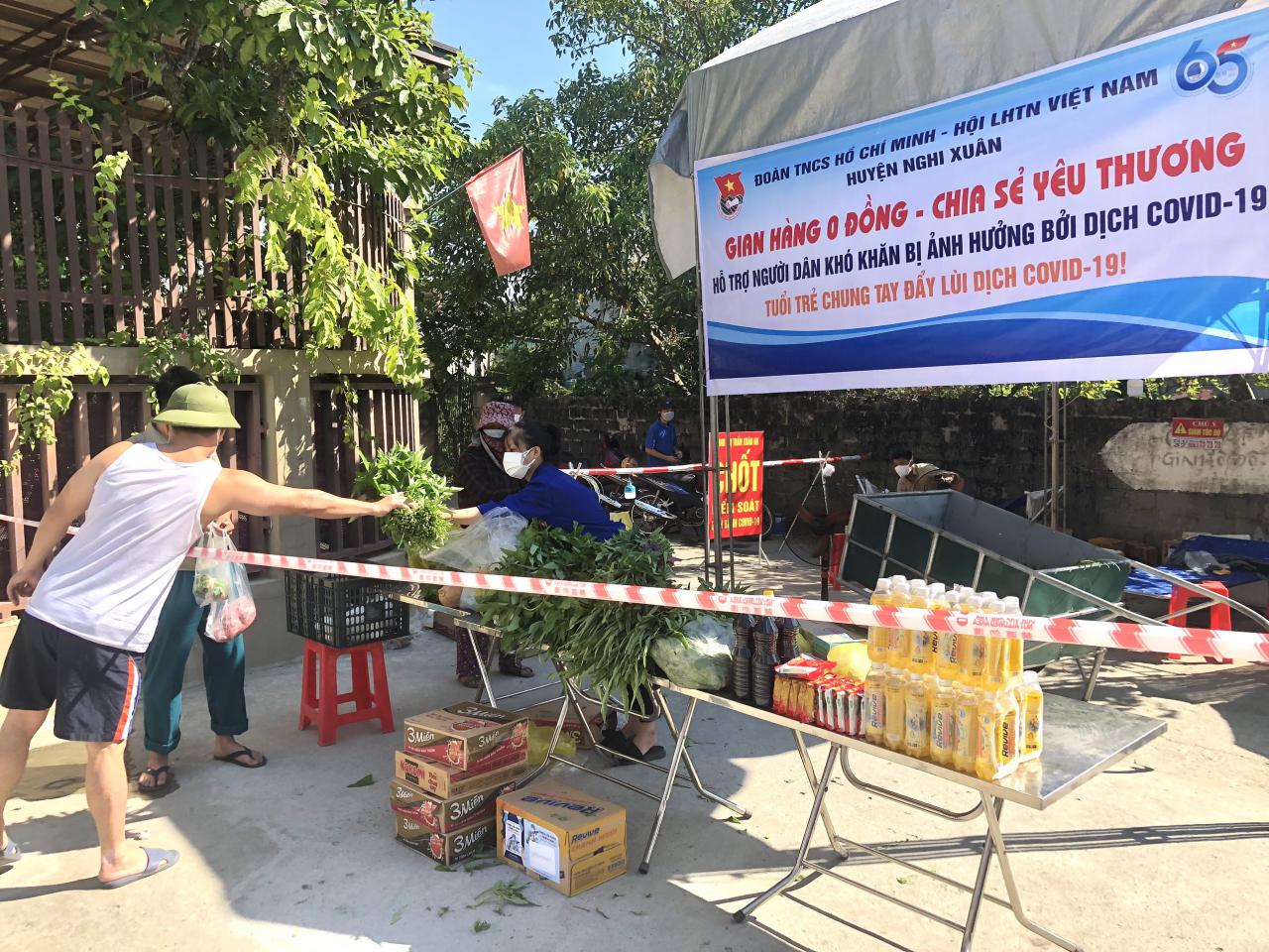 Tại Nghi Xuân, cùng đồng hành, chia sẻ với bà con nhân dân có hoàn cảnh khó khăn do ảnh hưởng bởi dịch Covid-19, Huyện đoàn Nghi Xuân triển khai mô hình “Gian hàng 0 đồng – chia sẻ yêu thương” tại khu vực phong toả Thị trấn Xuân An. Theo đó, đoàn viên thanh niên các cơ sở Đoàn trong toàn huyện đã tập trung đẩy mạnh các hoạt động tuyên truyền, kêu gọi nguồn lực hỗ trợ, trao tặng các nhu yếu phẩm, như: rau củ quả, trứng sữa, mì tôm, nước mắm, cá khô…. cho người dân vùng phong tỏa, cách ly. Bên cạnh, đó Đội TNTN đã bố trí phương tiện, đóng gói thực phẩm, chuyển trực tiếp cho các hộ khó khăn đang thực hiện cách ly trên địa bàn vùng dịch…