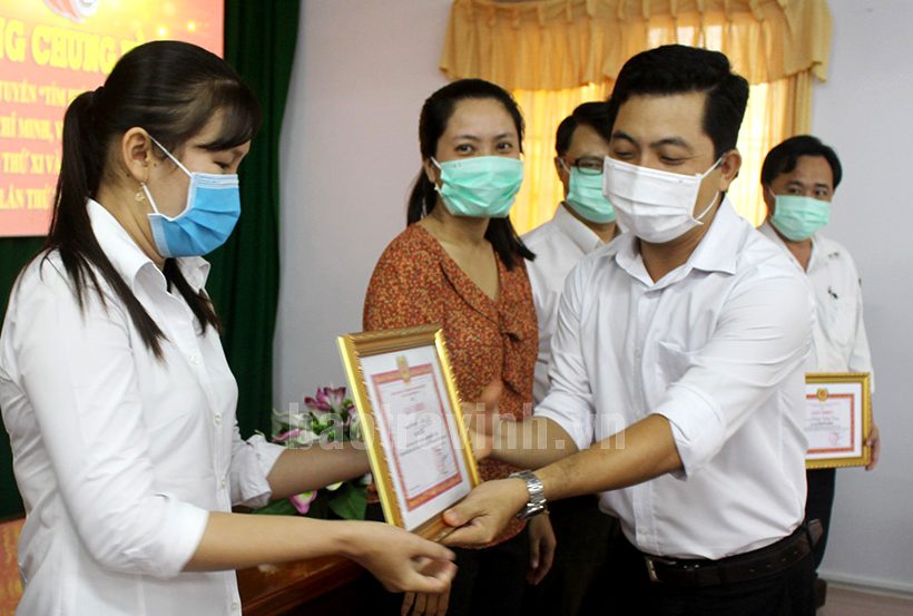 Anh Võ Minh Nhựt, Bí thư Chi bộ cơ quan Tỉnh Đoàn trao giấy khen cho các thí sinh đạt điểm cao tại cuộc thi.
