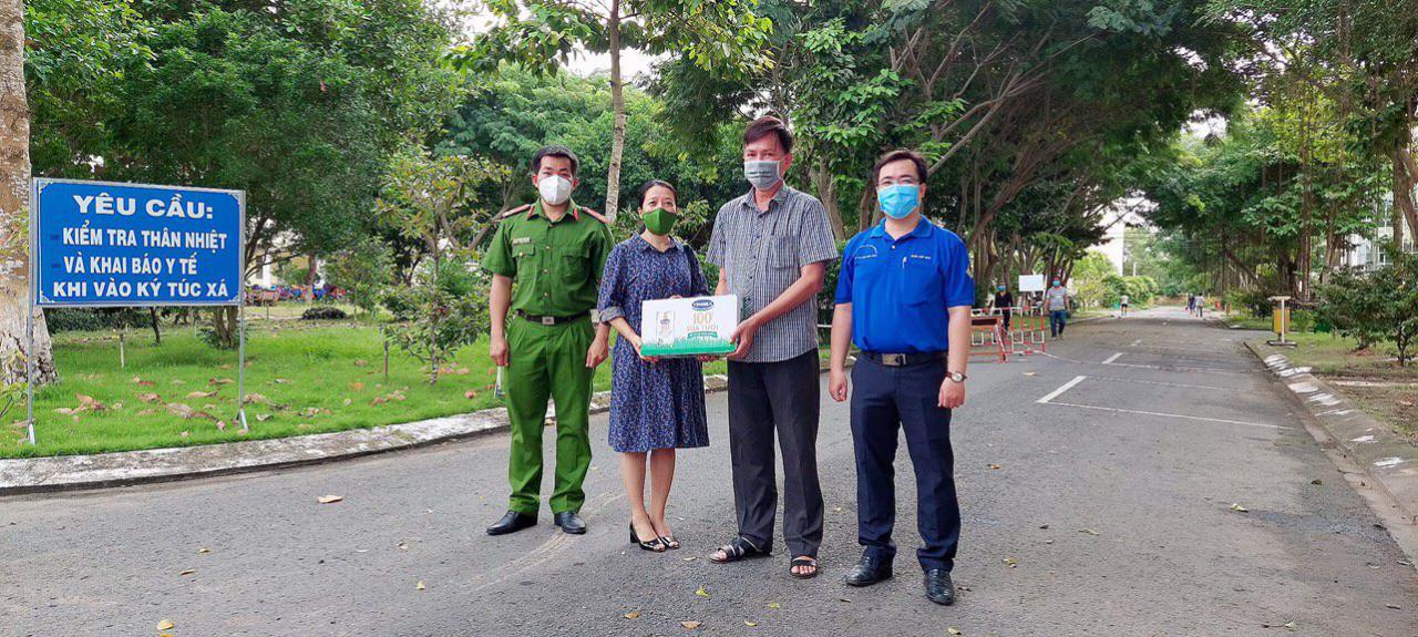 Đ/c Vương Kim Oanh, Giám đốc TTSHTTN trao sữa tại Khu cách ly Ký túc xá trường Đại học Trà Vinh