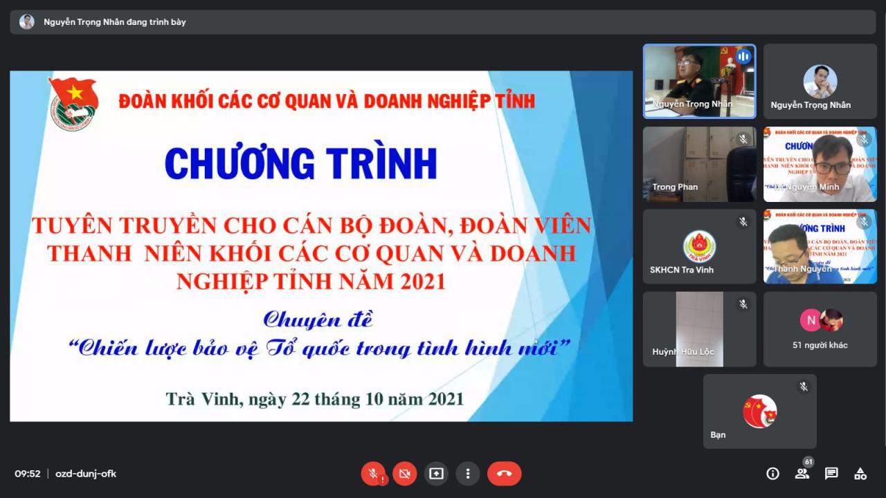 Ngày 22/10/2021, Ban Thường vụ Đoàn khối các cơ quan và doanh nghiệp tỉnh tổ chức hội nghị tập huấn trực tuyến cho cán bộ, đoàn viên thanh niên Khối các cơ quan và doanh nghiệp tỉnh năm 2021. Thành phần tham gia hội nghị gồm những đồng chí là ủy viên Ban Thường vụ; Ban Chấp hành Đoàn khối và các đồng chí là Bí thư và Phó Bí thư các cơ sở đoàn trực thuộc.