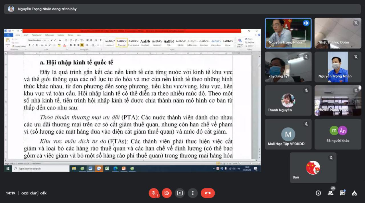 Buổi chiều do Trung tá Huỳnh Khắc Vũ, Phó Trưởng phòng Công tác Đảng và công tác chính trị, Công an tỉnh báo cáo chuyên đề về “nâng cao kiến thức về công tác hội nhập quốc tế, tuyên truyền đối ngoại cho cán bộ đoàn, đoàn viên thanh niên”. Tại hội nghị, báo cáo viên khái quát một số điểm mới như: Kết quả bước đầu của Việt Nam với vai trò là Chủ tịch ASEAN năm 2020 trong bối cảnh dịch bệnh COVID-19 diễn biến phức tạp gây ảnh hưởng không nhỏ đến các nước trong khu vực; những khó khăn, thách thức của Việt Nam trong vai trò Chủ tịch ASEAN…