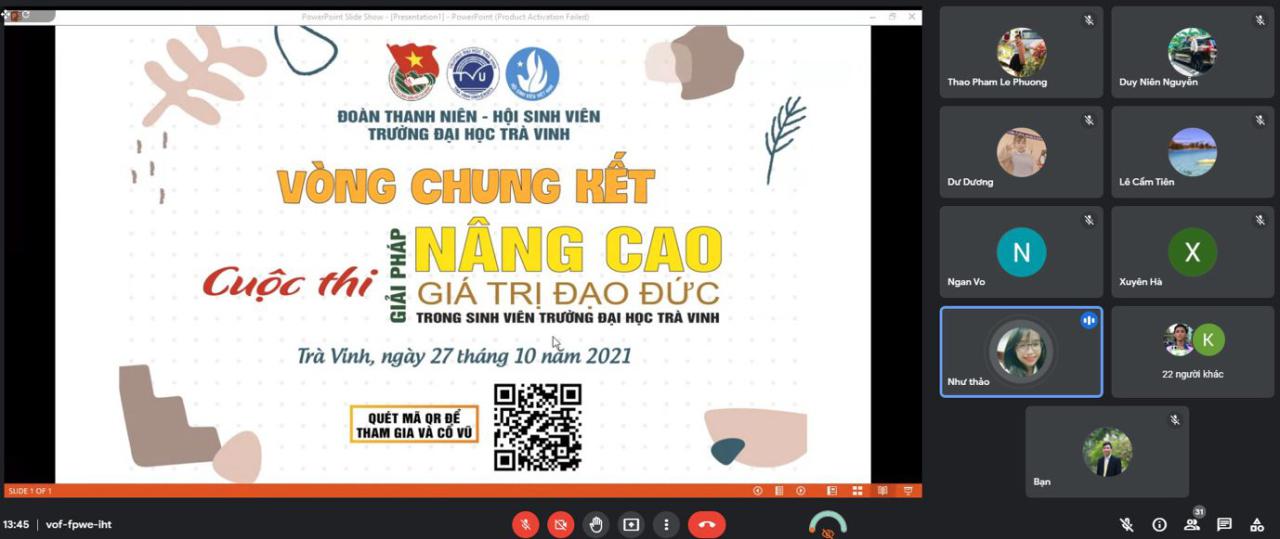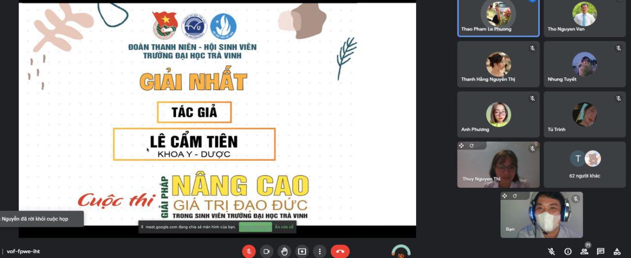 Vào lúc 14h00′ ngày 27/10/2021, Đoàn Thanh niên – Hội Sinh viên Trường đã tổ chức vòng chung kết cuộc thi “Giải pháp nâng cao giá trị đạo đức trong sinh viên Trường Đại học Trà Vinh” bằng hình thức online qua ứng dụng Google Meet với sự tham gia của 14 tác giả và nhóm tác giả.