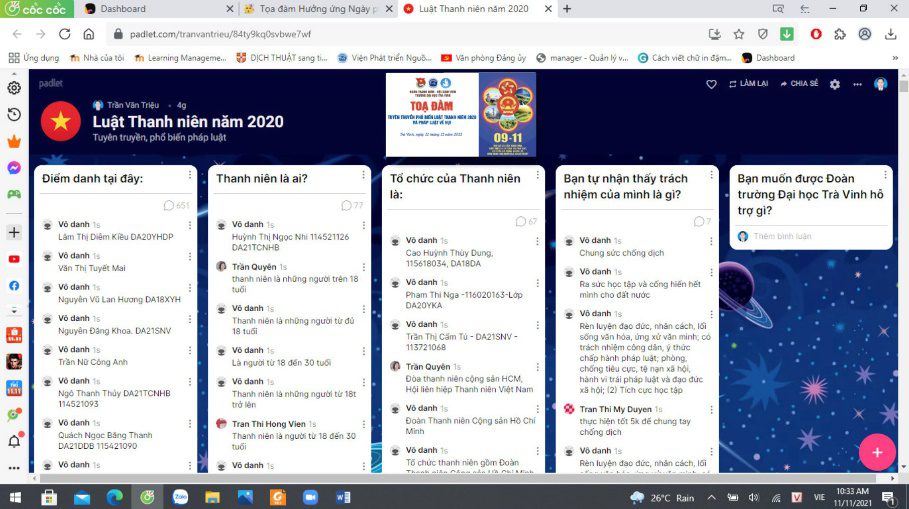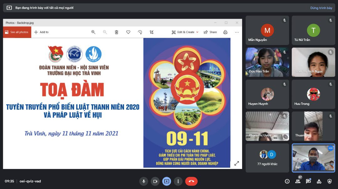 Chiều ngày 11/11/2021, Đoàn trường Đại học Trà Vinh đã tổ chức đã tổ chức các hoạt động tuyên truyền, phổ biến Luật Thanh niên năm 2020 và hoạt động góp hụi trên địa bàn tỉnh Trà Vinh năm 2021 cho hơn 1.400 lượt cán bộ, đoàn viên thanh niên Trường Đại học Trà Vinh thông qua hình thức online (qua ứng dụng Zoom và Google Meet).