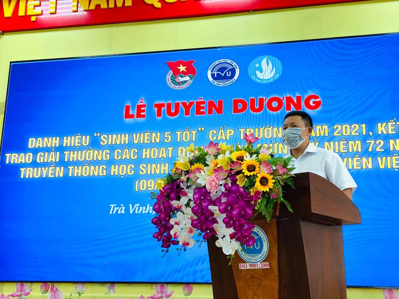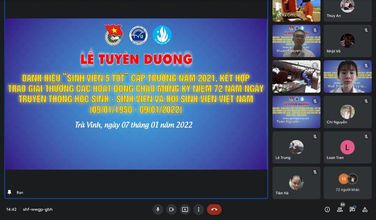 Trưa ngày 07/01/2022 Đoàn Thanh niên – Hội Sinh viên Trường Đại học Trà Vinh đã tổ chức buổi lễ tuyên dương Danh hiệu “Sinh viên 5 tốt” cấp trường năm 2021 và phát động phong trào “Sinh viên 05 tốt” năm 2022 thông qua hình thức vừa trực tiếp vừa trực tuyến.