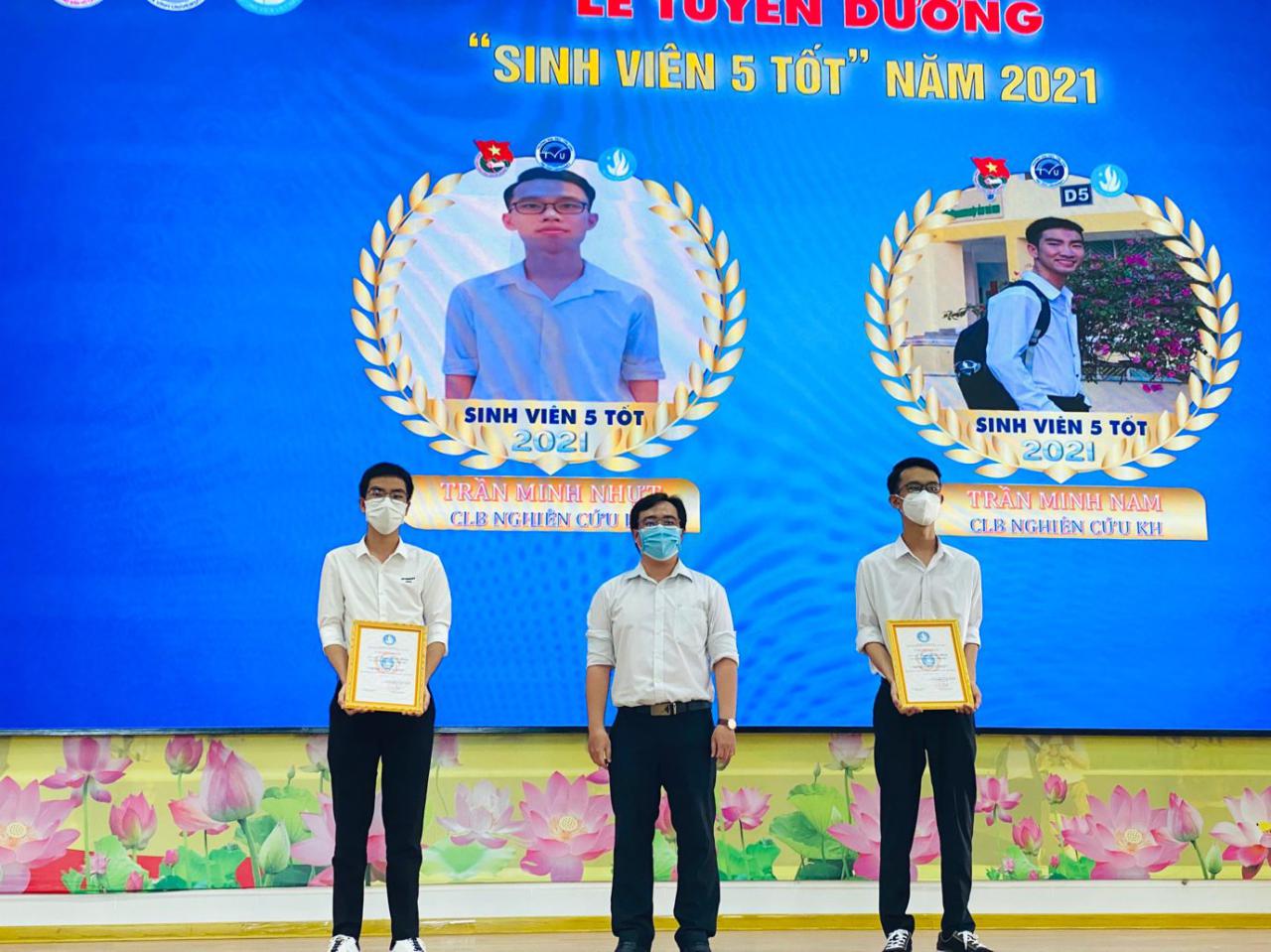 Sinh viên Trần Minh Nhựt và Trần Minh Nam đại diện cho 266 sinh viên đạt “Sinh viên 05 tốt” năm 2021 nhận chứng nhận từ Hội Sinh viên Trường