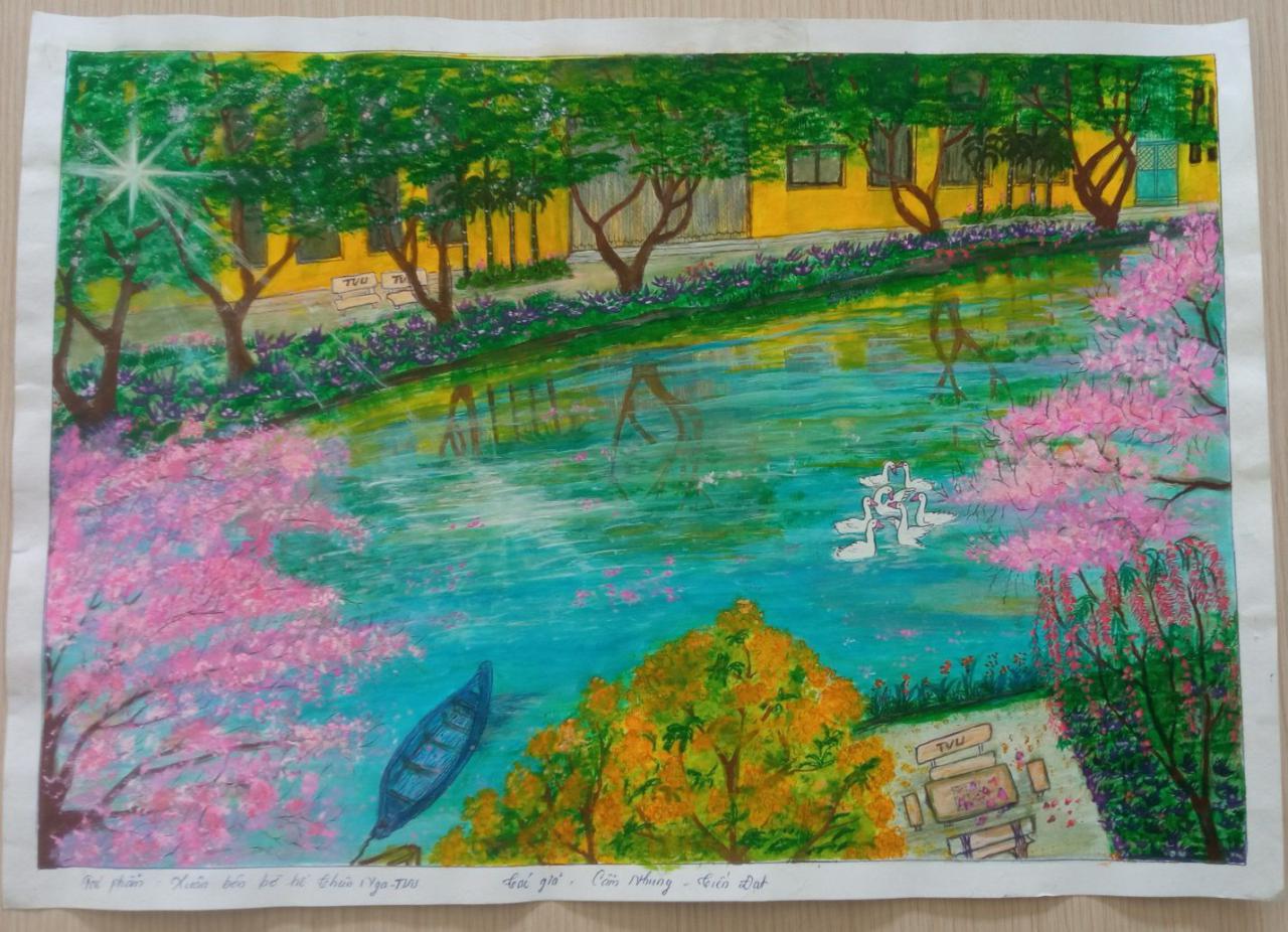 Tác phẩm Xuân bên bờ hồ Thiên Nga -TVU của nhóm tác giả Đổ Thị Cẩm Nhung – Phạm Tiến Đạt đạt giải Ba Hội thi Vẽ tranh “Mùa Xuân TVU”