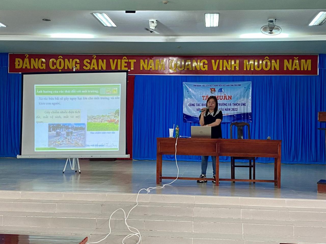 Trong các ngày 28/4 đến 24/5/2022, Tỉnh đoàn, Hội Liên hiệp Thanh niên Việt Nam tỉnh Trà Vinh tổ chức 09 lớp tập huấn ứng phó với biến đổi khí hậu và bảo vệ môi trường năm 2022 với sự tham gia của hơn 450 học viên là Bí thư, Phó Bí thư Đoàn cơ sở của 09 huyện, thị xã, thành phố trên địa bàn tỉnh. Tham gia lớp tập huấn các học viên đã được Báo cáo viên của Sở Tài nguyên và Môi trường Trà Vinh chia sẻ những kiến thức mới liên quan đến ứng phó với biến đổi khí hậu và công tác bảo vệ môi trường như: chuyển giao các vấn đề về công nghệ xử lý môi trường, xử lý rác thải hữu cơ thành phân bón và thức ăn chăn nuôi; Luật Bảo vệ môi trường; Quyền lợi của các tổ chức, cá nhân trong lĩnh vực bảo vệ môi trường và trách nhiệm quản lý nhà nước về môi trường các cấp.