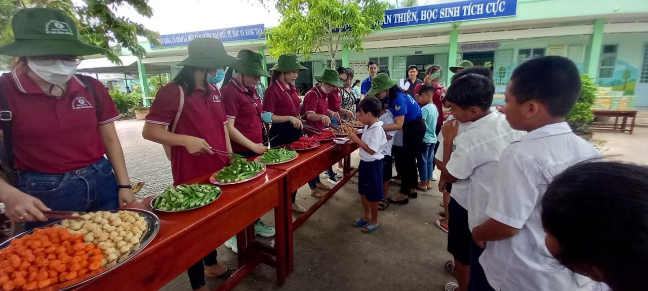 Đồng chí Phạm Phước Trãi, Phó Bí thư Đảng ủy Khối (áo xanh) và Đồng chí Nguyễn Trọng Nhân – Bí thư Đoàn khối (áo đỏ) trao góc học tập cho 02 em học sinh Trường Tiểu học Hiếu Trung A
