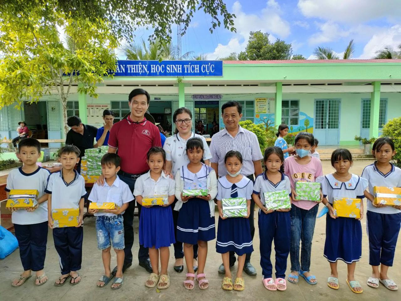 Tặng quà cho học sinh có hoàn cảnh khó khăn.