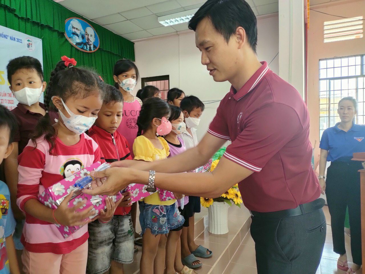 Anh Nguyễn Trọng Nhân, Bí thư Đoàn khối các Cơ quan và Doanh nghiệp tỉnh tặng quà cho các em thiếu nhi có hoàn cảnh khó khăn trên địa bàn xã Thạnh Hòa Sơn