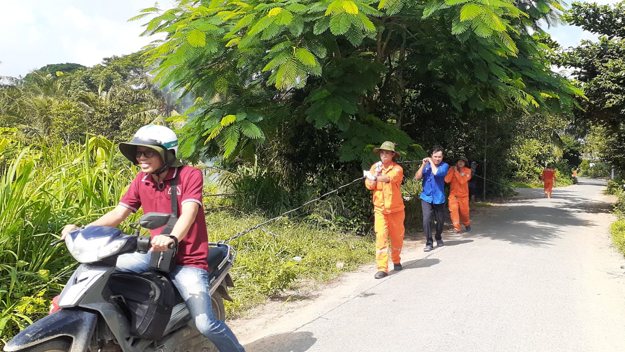 Các chiến sĩ đang thực hiện kéo dây tải điện trên tuyến đường 2,4km tại ấp Bào Môn