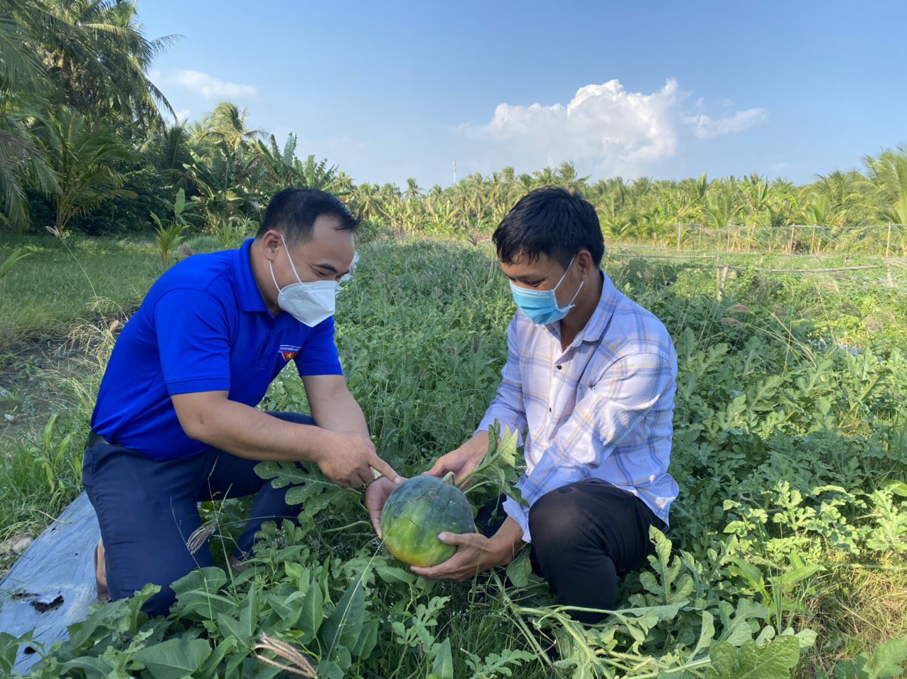 Thanh niên Trần Văn Tính bên mô hình Trồng dưa hấu An Tiêm