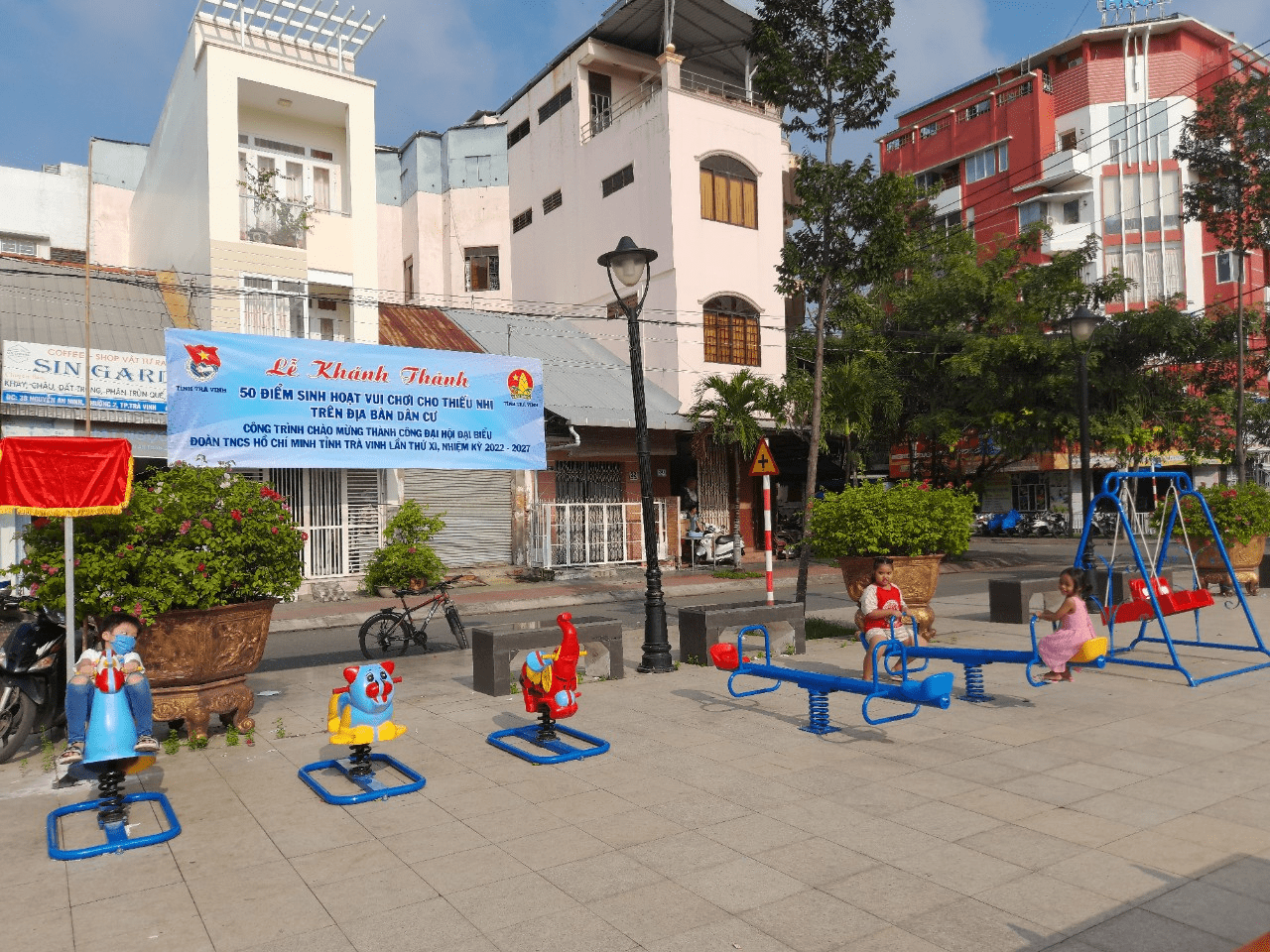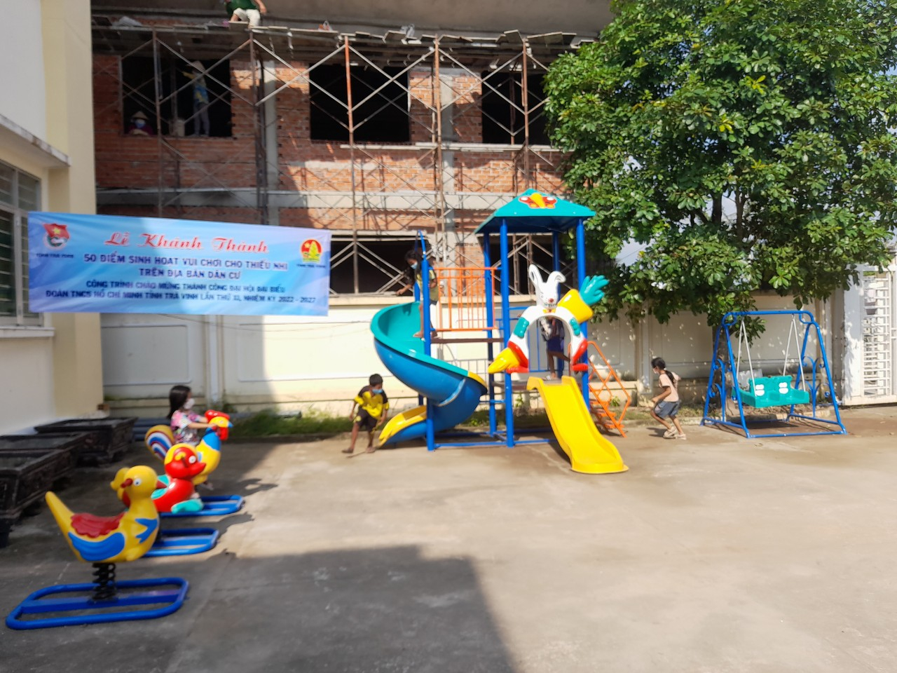 50 điểm sinh hoạt vui chơi cho thiếu nhi được lắp đặt tại các địa điểm như: Công viên, Nhà Văn hóa cộng đồng, khu viên trường Mẫu giáo, Tiểu học, cụm hành chính xã… trên địa bàn 8 huyện, thị, thành phố. Mỗi điểm được lắp đặt gồm các thiết bị như: 2 bập bênh, 1 cầu trượt, 1 xích đu, 3 thú nhún lò xo; kinh phí 50 triệu đồng. Tổng tổng kinh phí 50 điểm là 2,5 tỷ đồng (nguồn kinh phí từ Đề án xây dựng điểm sinh hoạt, vui chơi cho thanh thiếu nhi trên địa bàn tỉnh Trà Vinh, giai đoạn 2021-2022 của Ban Thường vụ Tỉnh đoàn, được UBND tỉnh phê duyệt tại Công văn số 4167/UBND-KGVX, ngày 15/9/2021).