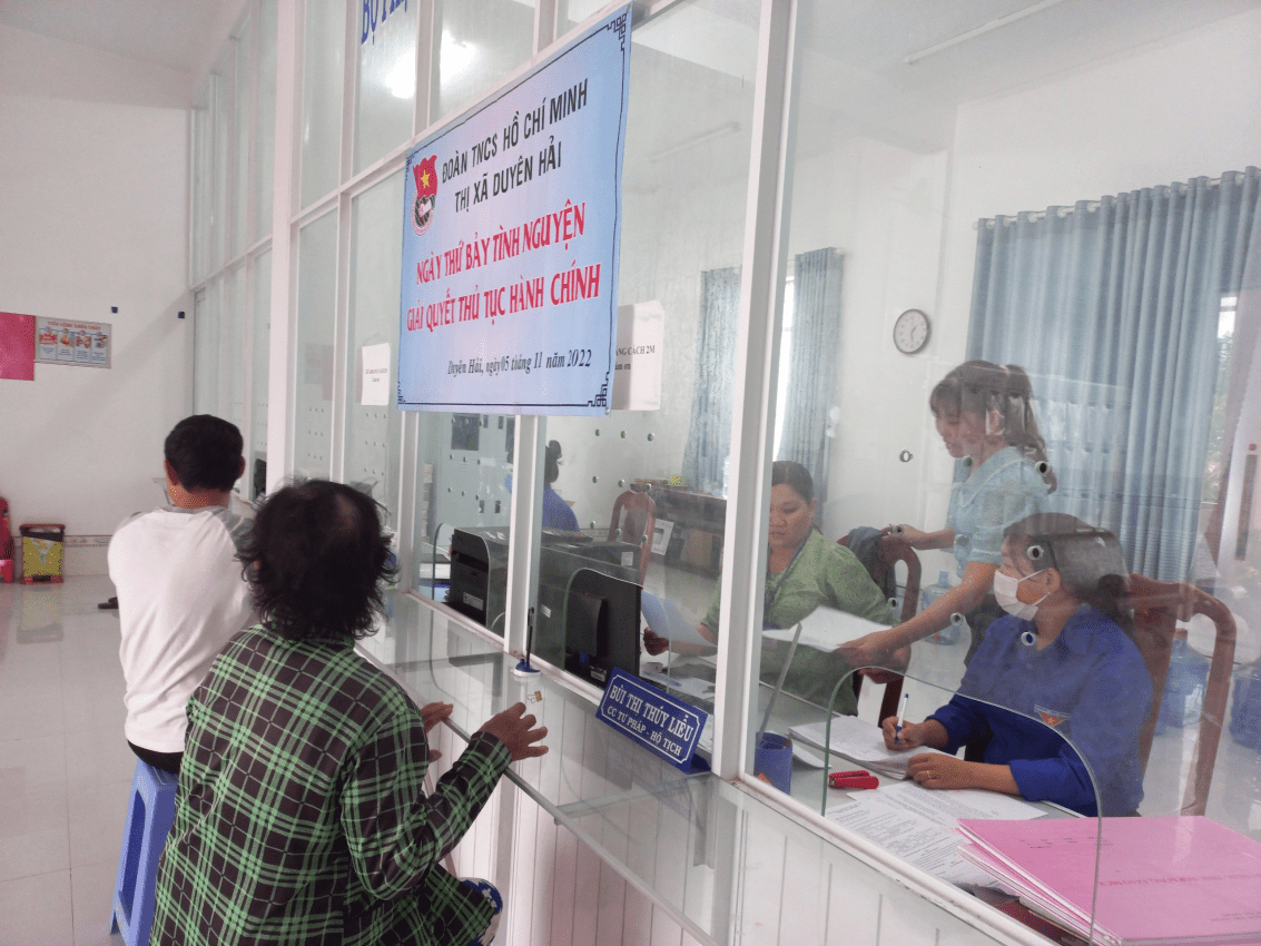 Đoàn viêm thanh niên thị xã Duyên Hải tham gia giải quyết thủ tục hành chính cho Nhân dân vào ngày thứ Bảy