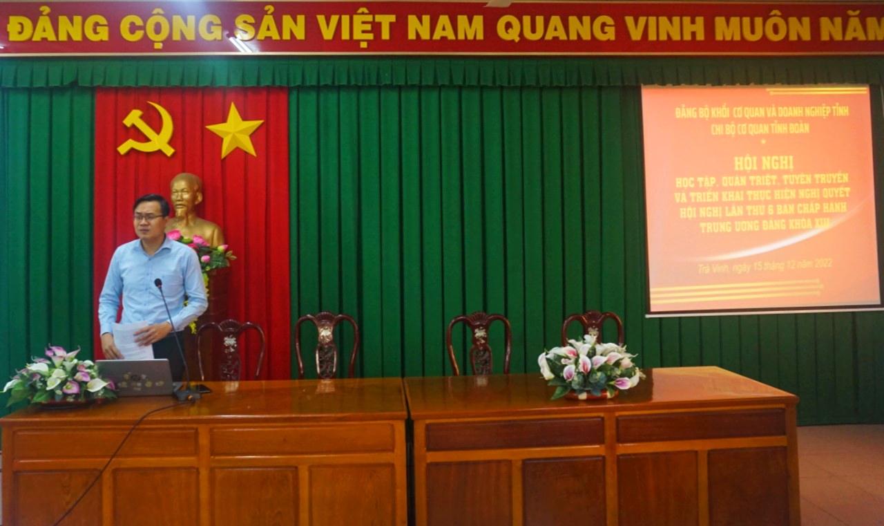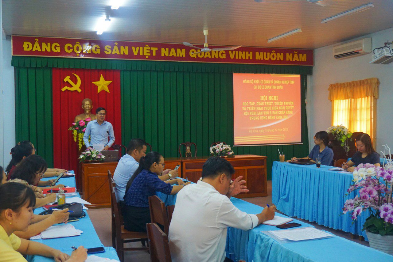 Nhằm nâng cao công tác giáo dục chính trị tư tưởng cho cán bộ, Đảng viên, đoàn viên, sáng ngày 21/12, tại Hội trường cơ quan Tỉnh đoàn, Chi bộ cơ quan Tỉnh đoàn tổ chức Hội nghị học tập, quán triệt, tuyên truyền và triển khai thực hiện nghị quyết hội nghị lần thứ 6 Ban Chấp hành Trung ương Đảng khóa XIII, có 100% cán bộ, đảng viên, đoàn viên tham dự.