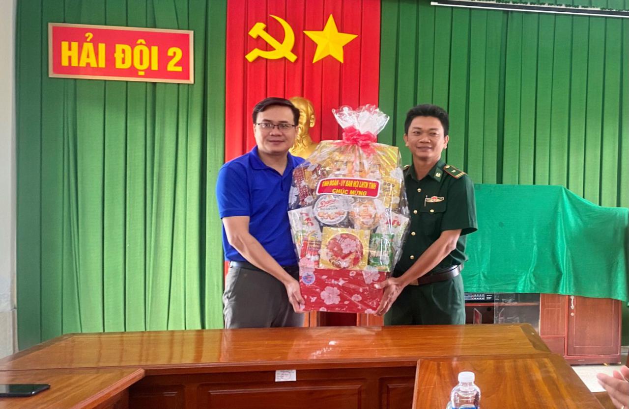 Đồng chí Nguyễn Thanh Nhã, Phó Bí thư Tỉnh đoàn tặng quà chúc mừng cho cán bộ, chiến sỹ Hải đội Biên phòng 2