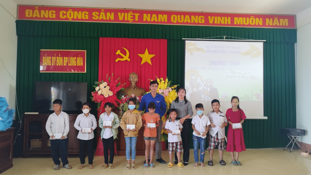 Thầy Phạm Văn Luận và mạnh thường quân trao các phần quà hỗ trợ học sinh có hoàn cảnh khó khăn hiếu học nhân dịp Xuân Quý Mão năm 2023 tại Đồn Biên phòng Long Hòa