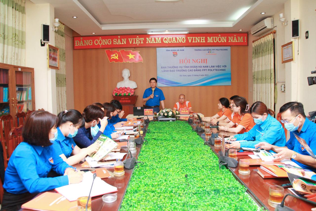 Tham dự buổi làm việc có đồng chí Trần Ngọc Nam – Ủy viên BTV Trung ương Đoàn, TUV, Bí thư Tỉnh đoàn, Chủ tịch Hội LHTN Việt Nam tỉnh; đồng chí Trần Hữu Thiện – Giám đốc FPT Polytechnic Hà Nam; các đồng chí Thường trực, lãnh đạo các Ban chuyên môn Tỉnh đoàn; Bí thư các Huyện, Thị, Thành đoàn và Đoàn trực thuộc.