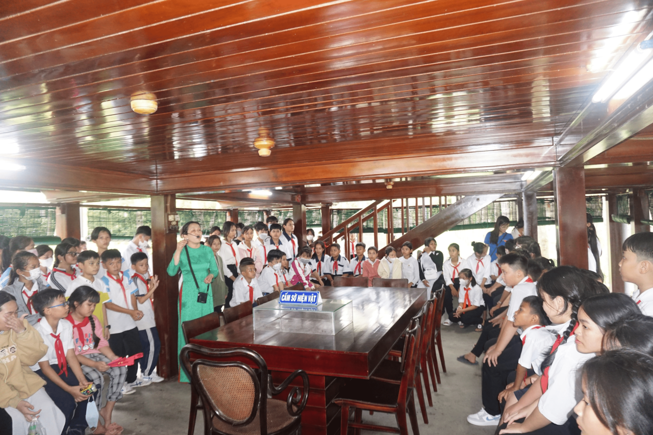 Các em học sinh được nghe thuyết minh về quá trình xây dựng Đền thờ Bác và tham quan mô hình nhà sàn Bác Hồ