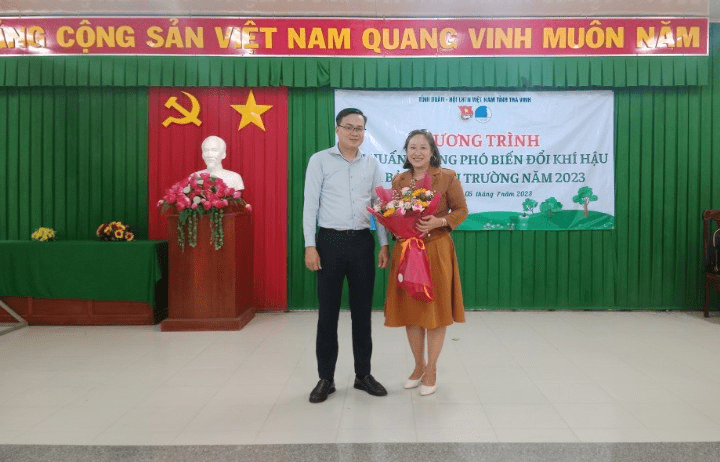 (Đ/c Nguyễn Thanh Nhã, Phó Bí thư Tỉnh đoàn tặng hoa cảm ơn Tiến sĩ Trần Thị Ngọc Bích, Phó Viện Trưởng, Viện Khoa học công nghệ môi trường, Trường ĐHTV, Báo cáo viên các lớp tập huấn)