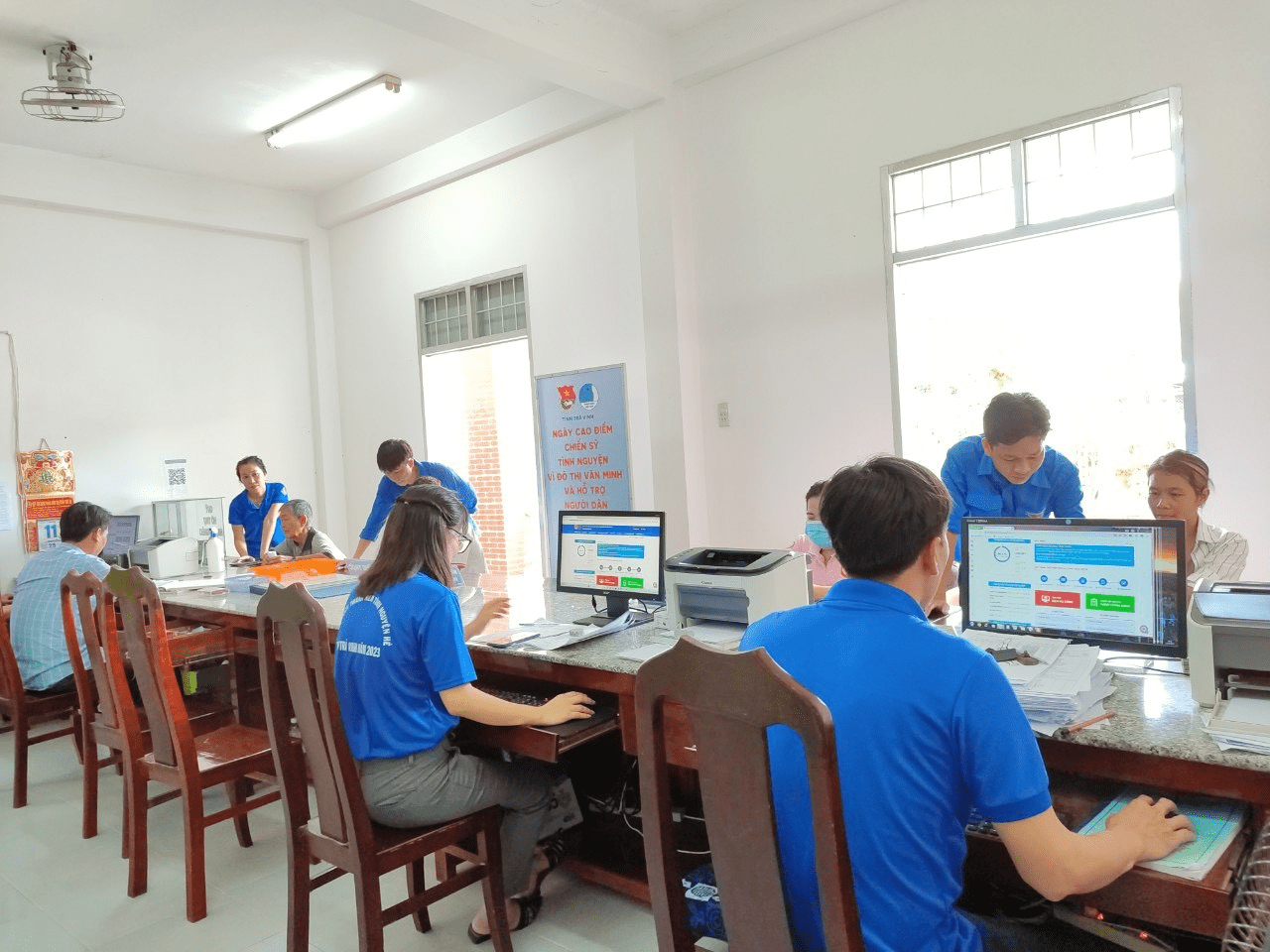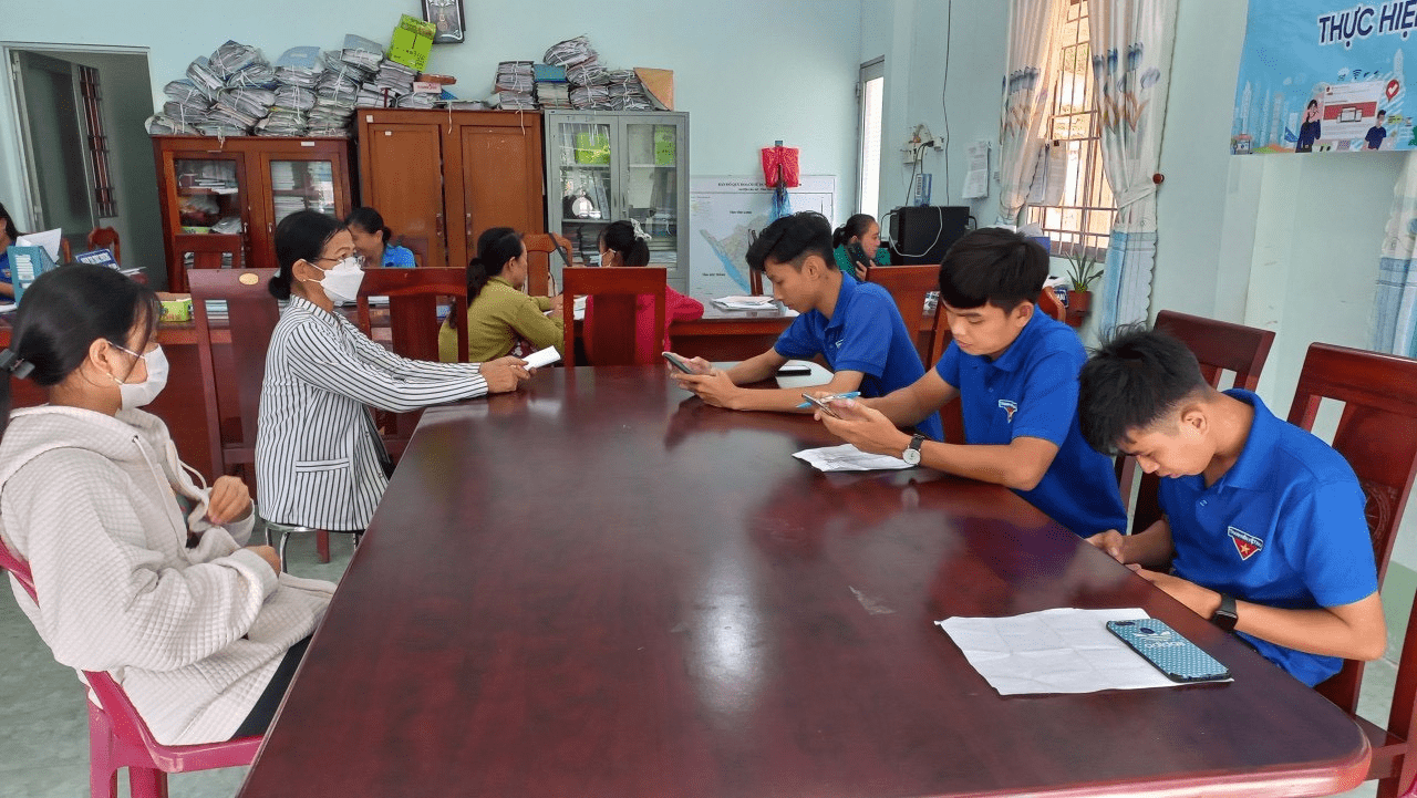 (ĐVTN Thị trấn Trà Cú phối hợp với bộ phận một cửa của UBND hỗ trợ người dân thực hiện trên Cổng Dịch vụ công)