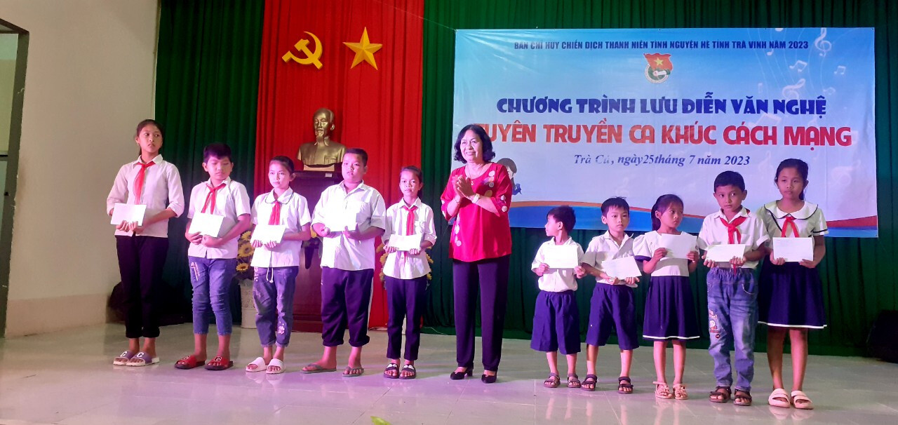 Thực hiện theo sự chỉ đạo của Ban Thường vụ Tỉnh đoàn, ngày 25 và 28/7/2023 Đội Tuyên truyền ca khúc cách mạng của tỉnh đã tổ chức 02 Chương trình văn nghệ phục vụ người dân và các chiến sỹ thanh niên tình nguyện hè tại huyện Trà Cú và huyện Châu Thành. Tại các đêm diễn, Ban Thường vụ Tỉnh đoàn đã đã vận động nguồn lực và trao tặng cho thiếu nhi có hoàn cảnh khó khăn các phần quà ý nghĩa gồm: 35 suất học bổng, 1.000 quyển tập, nhu yếu phẩm, bánh kẹo….với tổng kinh phí 27.700.000 đồng.