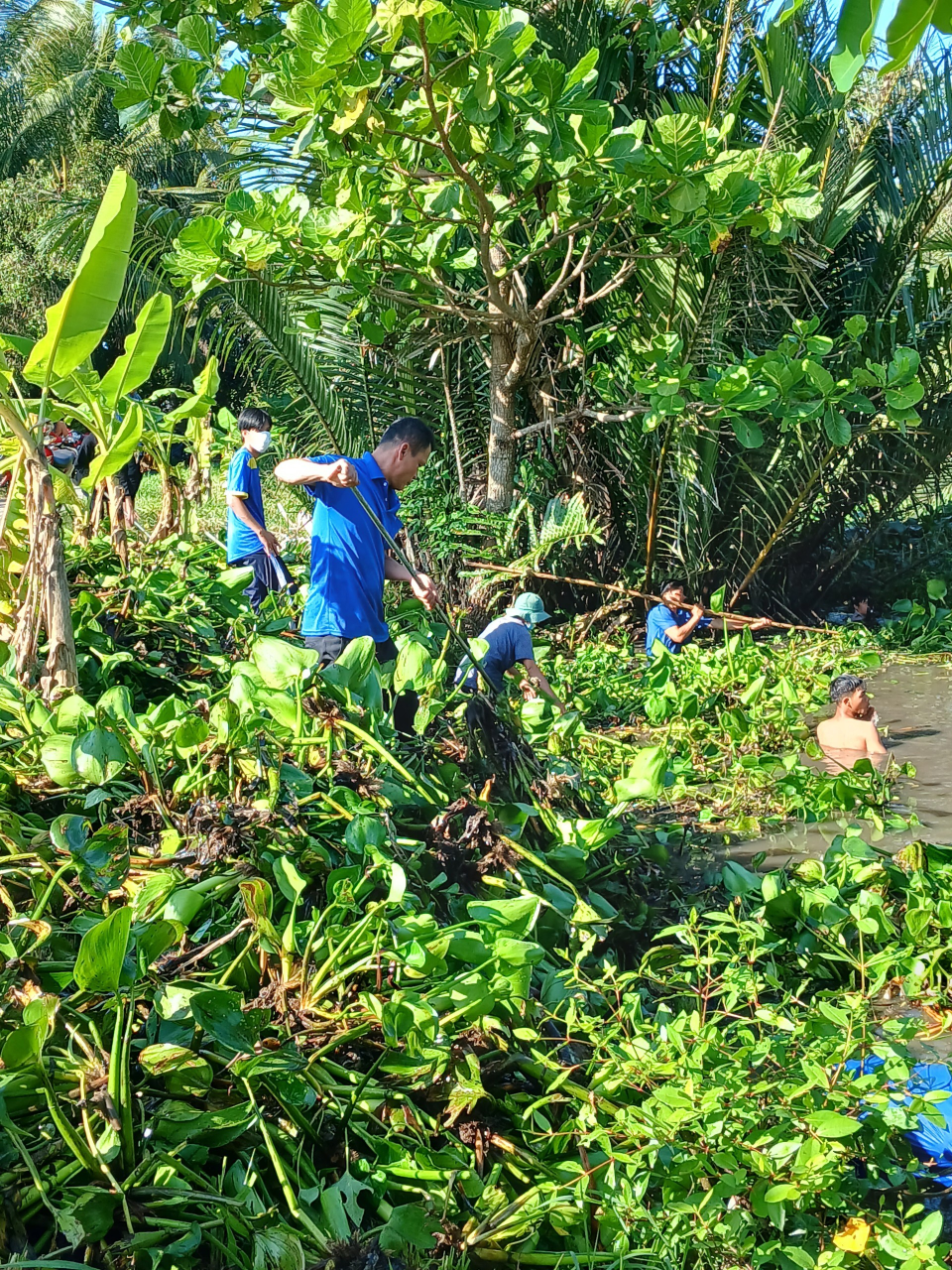 (Đoàn viên, thanh niên và người dân vớt lục bình khơi thông dòng chảy)