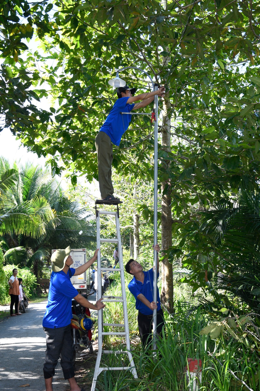 (Lực lượng sửa chữa tuyến đèn đường thắp sáng đường quê)