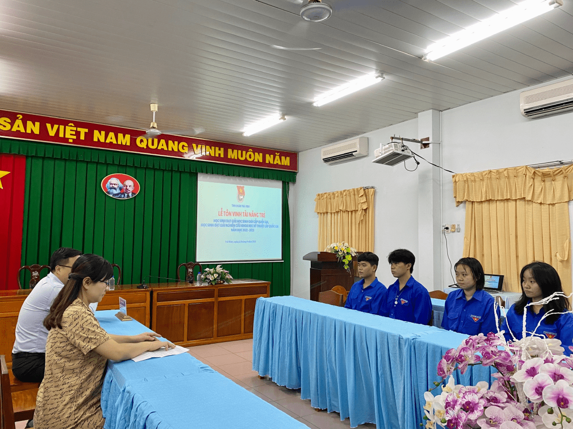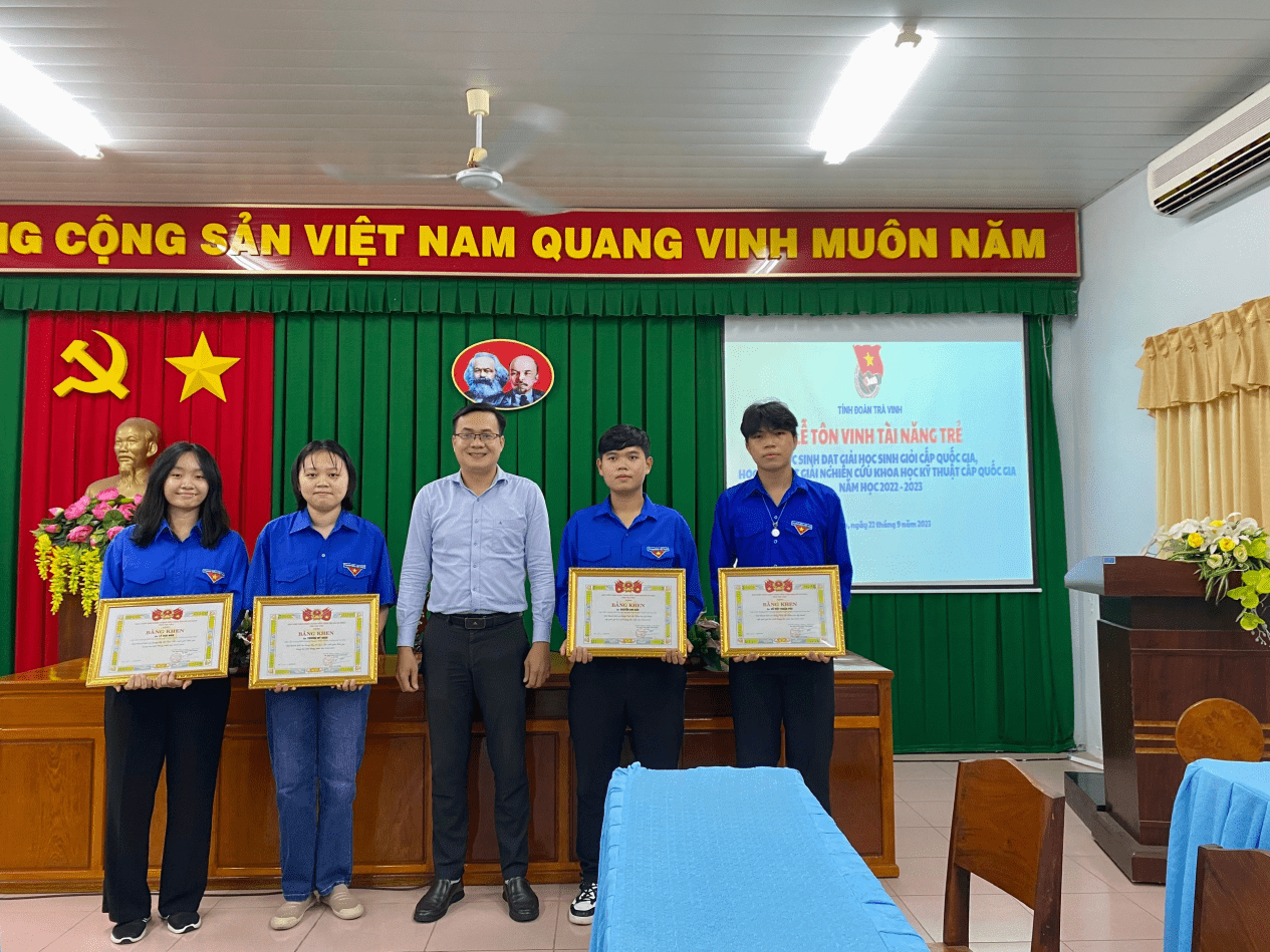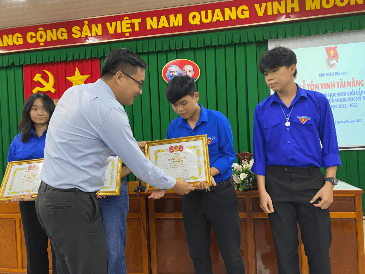 Với mục đích bồi dưỡng, tôn vinh và phát huy các tài năng trẻ trên địa bàn tỉnh Trà Vinh, từ đó tạo động lực và truyền cảm hứng cho các bạn trẻ, thúc đẩy phong trào thi đua học tập, rèn luyện, Ban Chấp hành Tỉnh đoàn quyết định tặng Bằng khen cho 08 gương mặt trẻ là những đoàn viên, thanh thiếu niên tiêu biểu nhất trong các lĩnh vực học tập, nghiên cứu khoa học trên địa bàn tỉnh Trà Vinh. Các em đã đạt giải cao tại Kỳ thi Học sinh giỏi quốc gia THPT, Cuộc thi khoa học kỹ thuật cấp quốc gia năm học 2022-2023, cụ thể gồm: 01 giải Nhì, 02 giải Ba và 05 giải Khuyến khích. Đây là thành quả xứng đáng của quá trình học tập, rèn luyện không ngừng nghỉ của các em học sinh.