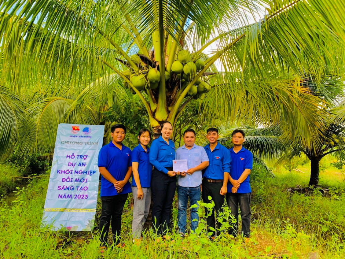 Thường trực huyện đoàn Châu Thành đến thăm hỏi, động viên tại vườn dừa sáp của anh Trần Quang Huy