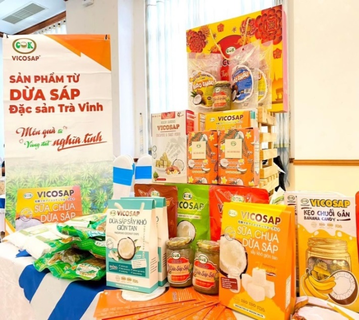 Đầu tiên, đó là dự án “sản xuất các sản phẩm thực phẩm từ Dừa sáp” của anh Trần Duy Linh – Giám đốc công ty chế biến dừa sáp Cầu Kè (Vicosap) – Công ty đầu tiên đầu tư vào dây chuyền công nghệ, chế biến chuyên sâu, đa dạng sản phẩm từ trái “Dừa sáp” (một loại dừa đặc sản, chỉ có tại Trà Vinh). Với những thành công mà anh đã cùng công ty đạt được trong nhữn năm qua, năm nay dự án của anh tiếp tục được Tỉnh đoàn, Hội Liên hiệp Thanh niên Việt Nam tỉnh hỗ trợ thủ tục, hồ sơ, kết nối để được nhận Bằng khen của Ban Chấp hành Trung ương Đoàn vì đã có thành tích xuất sắc trong thực hiện phong trào “Tuổi trẻ sáng tạo” năm và giới thiệu sản phẩm của Công ty tham gia trưng bày tại Liên hoan “Tuổi trẻ sáng tạo Cụm sông Tiền năm 2023” được tổ chức tại tỉnh Bến Tre, và tham gia trưng bày tại các diễn đàn, hội thảo, hội nghị trong và ngoài tỉnh. Bên cạnh đó, còn hỗ trợ thủ tục, hồ sơ để đề xuất Bộ Nông nghiệp và phát triển nông thôn công nhận sản phẩm “Dừa sáp sợi Vicosap” đạt chuẩn OCOP 5 sao cấp Quốc gia (theo Quyết định số 276/QĐ-BNN-VPĐP, ngày 20/6/2023).