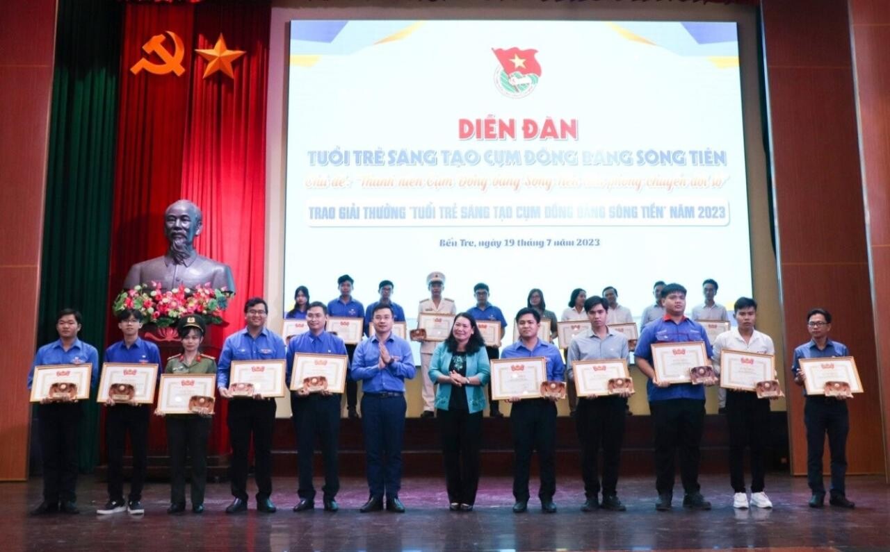Anh Trần Duy Linh (thứ 5 bên trái sang) nhận Bằng khen của Trung ương Đoàn tại Liên hoan Tuổi trẻ sáng tạo Cụm Sông Tiền năm 2023