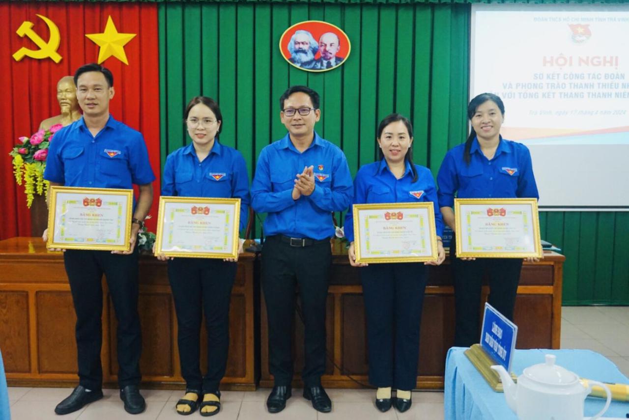 Tại hội nghị đồng chí Trần Trí Cường thay mặt Ban Chấp hành Tỉnh đoàn trao bằng khen cho 05 tập thể có thành tích xuất sắc trong triển khai thực hiện Tháng Thanh niên năm 2024 gồm Huyện đoàn Cầu Kè, Châu Thành, Trà Cú, Đoàn Khối các Cơ quan và doanh nghiệp tỉnh và Ban Phong trào Tỉnh đoàn.