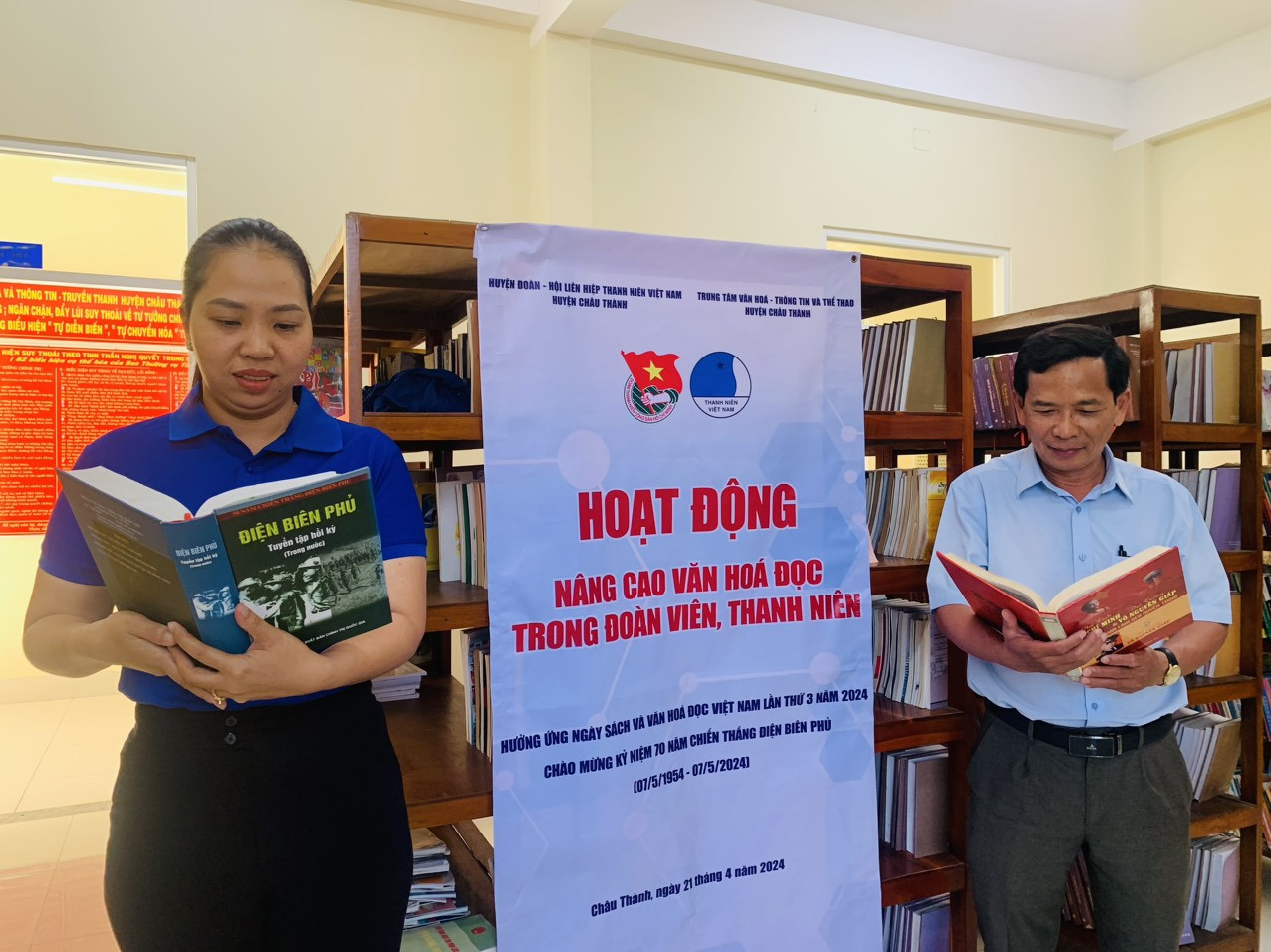 Đồng chí Nguyễn Thị Diễm Thơ, Phó Bí thư Huyện đoàn và đồng chí Huỳnh Quốc Vũ, Giám Đốc Trung tâm Văn hóa – Thông tin và Thể thao huyện tham gia đọc sách hưởng ứng Ngày sách và Văn hoá đọc Việt Nam lần thứ 3 năm 2024 và Chào mừng Kỷ niệm 70 năm chiến thắng Điện Biên Phủ (07/51954 – 07/5/2024)