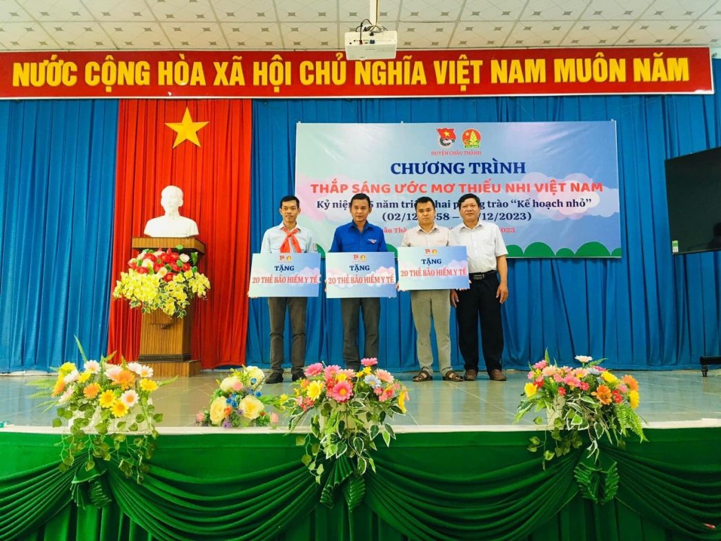 Ảnh: trao Hội đồng Đội huyện Châu Thành trao bảng tượng trưng Bảo hiểm y tế cho các trường trên địa bàn huyện