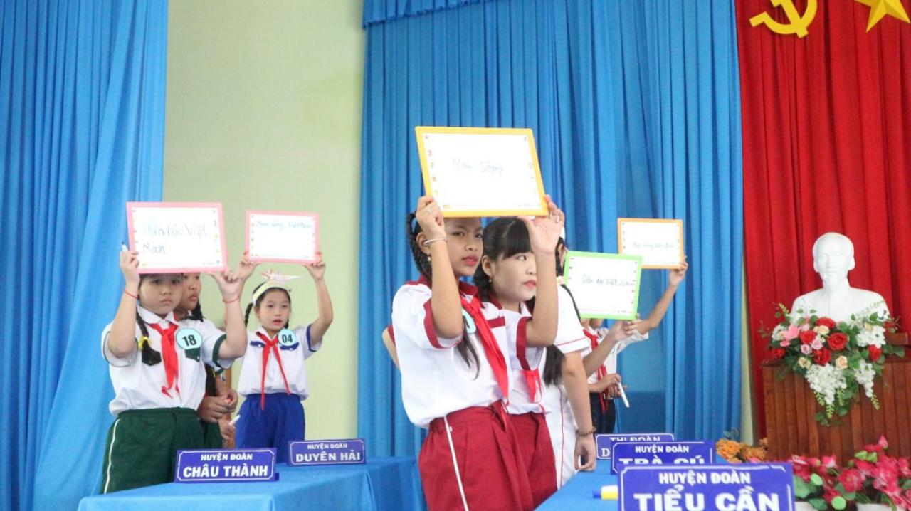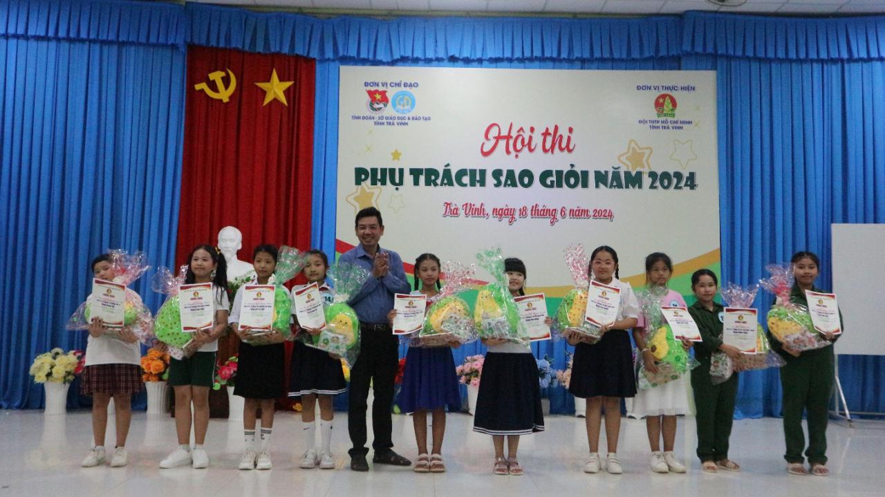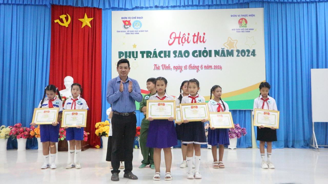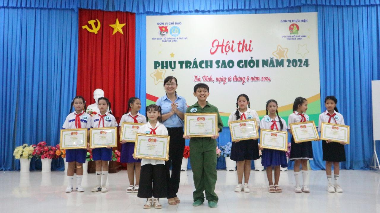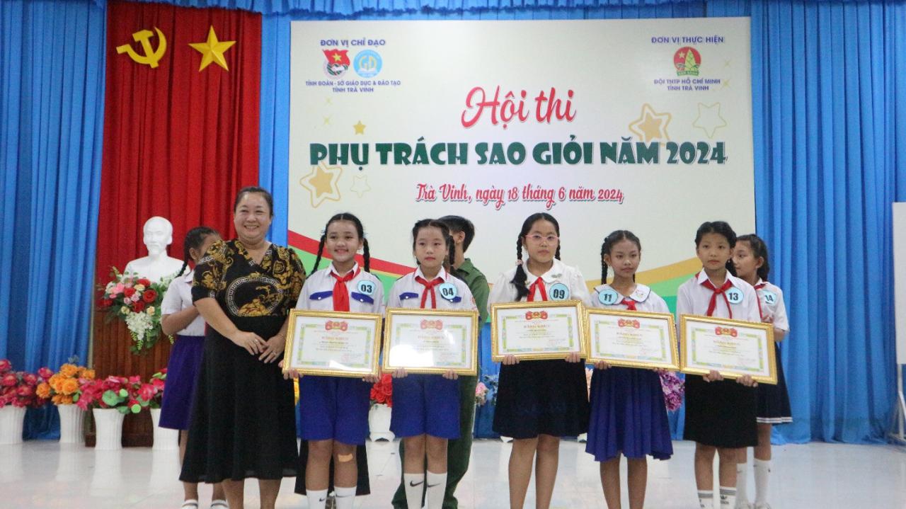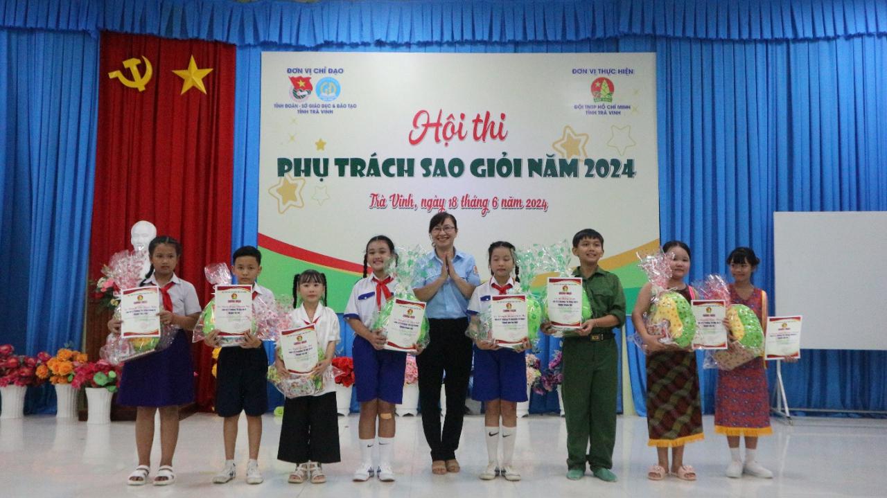 Đồng chí Nguyễn Thị Tuyết Nhung – Phó Giám đốc Trung tâm Sinh hoạt Thanh thiếu nhi tỉnh, Ban Giám khảo Hội thi trao giải khuyến khích cho các em Thạch Nguyễn Thanh Vy, lớp 4/1 và em Lê Hồng Ngọc, lớp 5/1, Trường Tiểu học Đông Hải A, huyện Duyên Hải; em Trần Quỳnh Anh, lớp 4/1, Trường Tiểu học Đại An A, huyện Trà Cú; em Huỳnh Thị Ngọc Hân, lớp 4/2, Trường Tiểu học Hiếu Trung B, huyện Tiểu Cần; em Trần Khánh Tuyết; lớp 5/1, Trường Tiểu học Châu Văn Liêm, Thị xã Duyên Hải