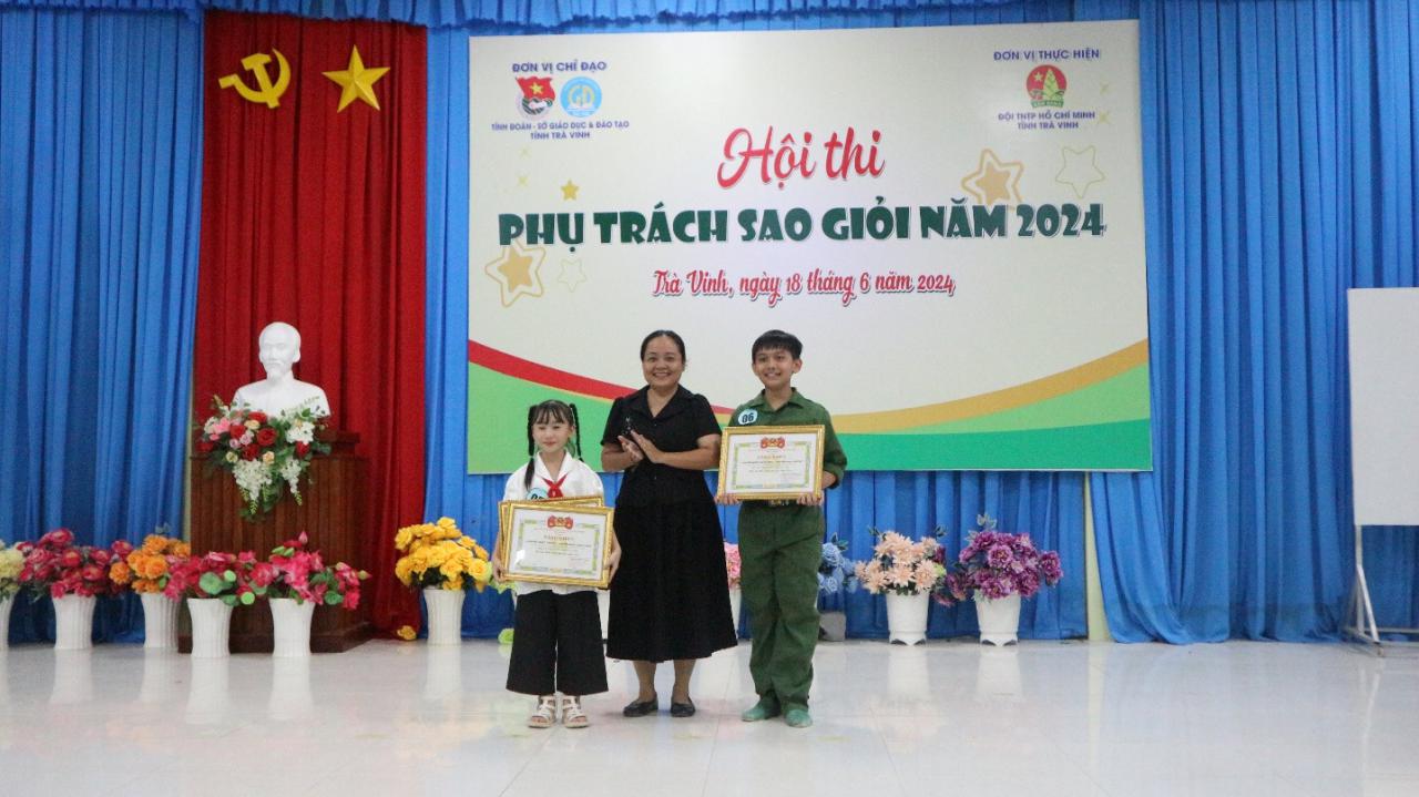 Đồng chí Lữ Cẩm Hương – Ban Giám khảo Hội thi trao giải thí sinh có phần thi Sinh hoạt Sao xuất sắc cho em Nguyễn Ngọc Diễm My và trao giải có Tiết mục năng khiếu xuất sắc nhất cho đơn vị Thành phố Trà Vinh