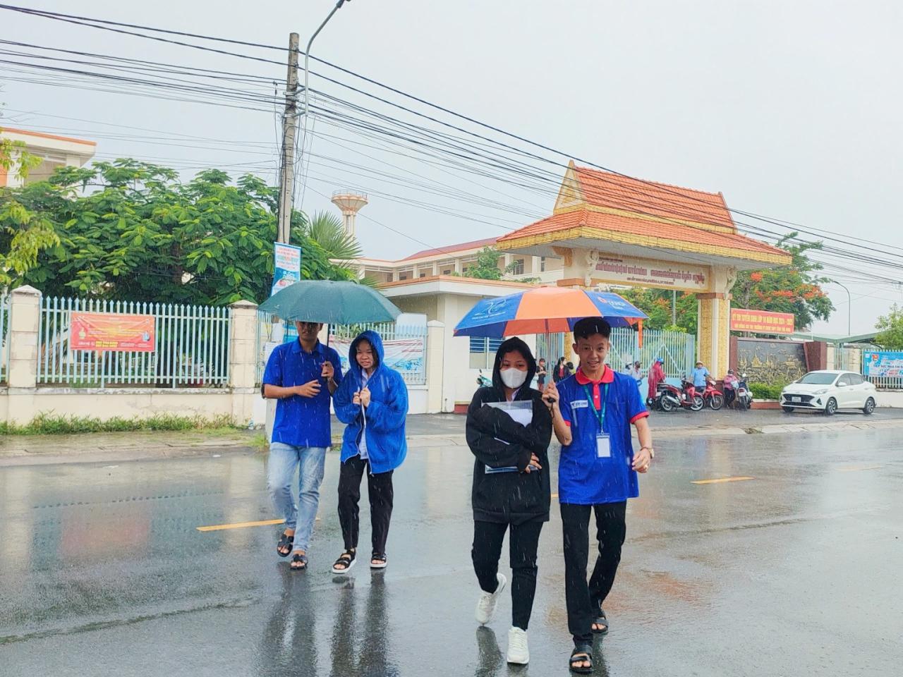 Các tình nguyện viên che mưa cho thí sinh