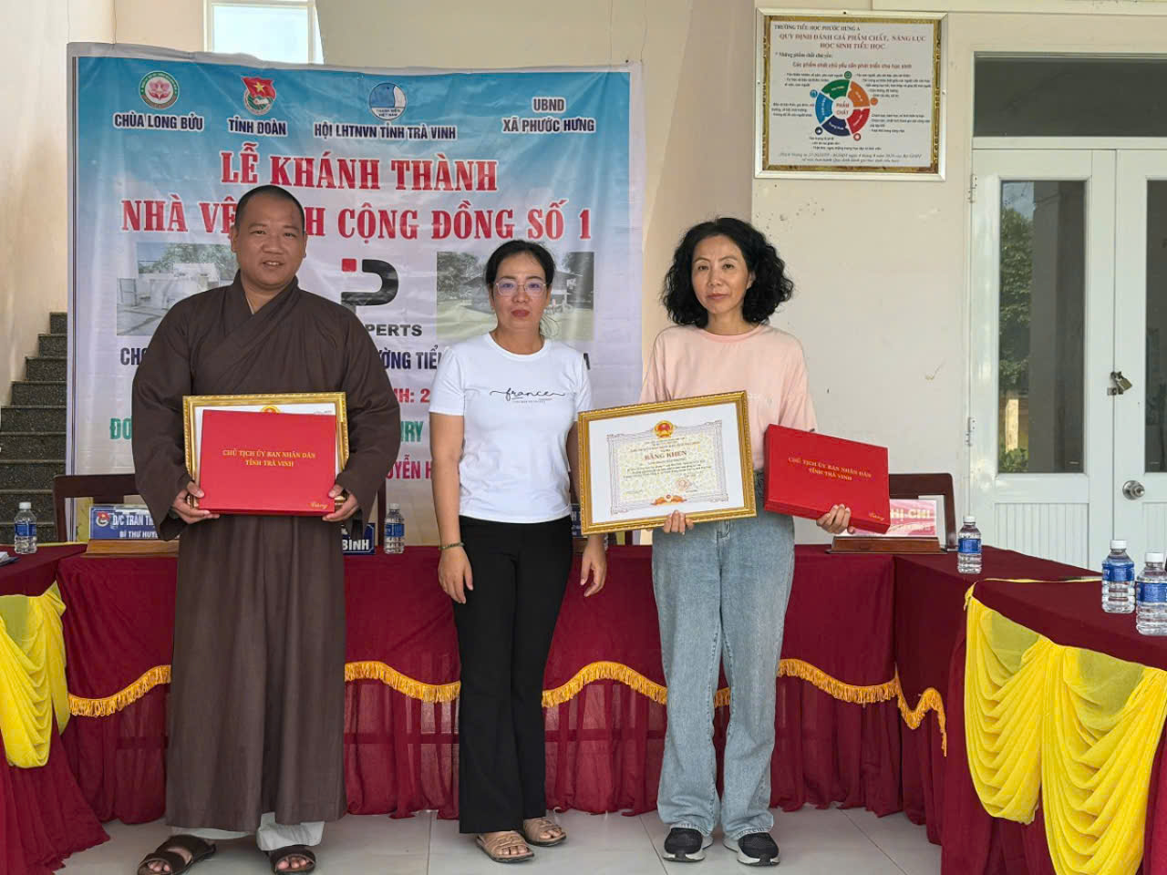 Hình ảnh bàn giao công trình và lãnh đạo xã Phước Hưng trao bằng khen cho đơn vị tài trợ