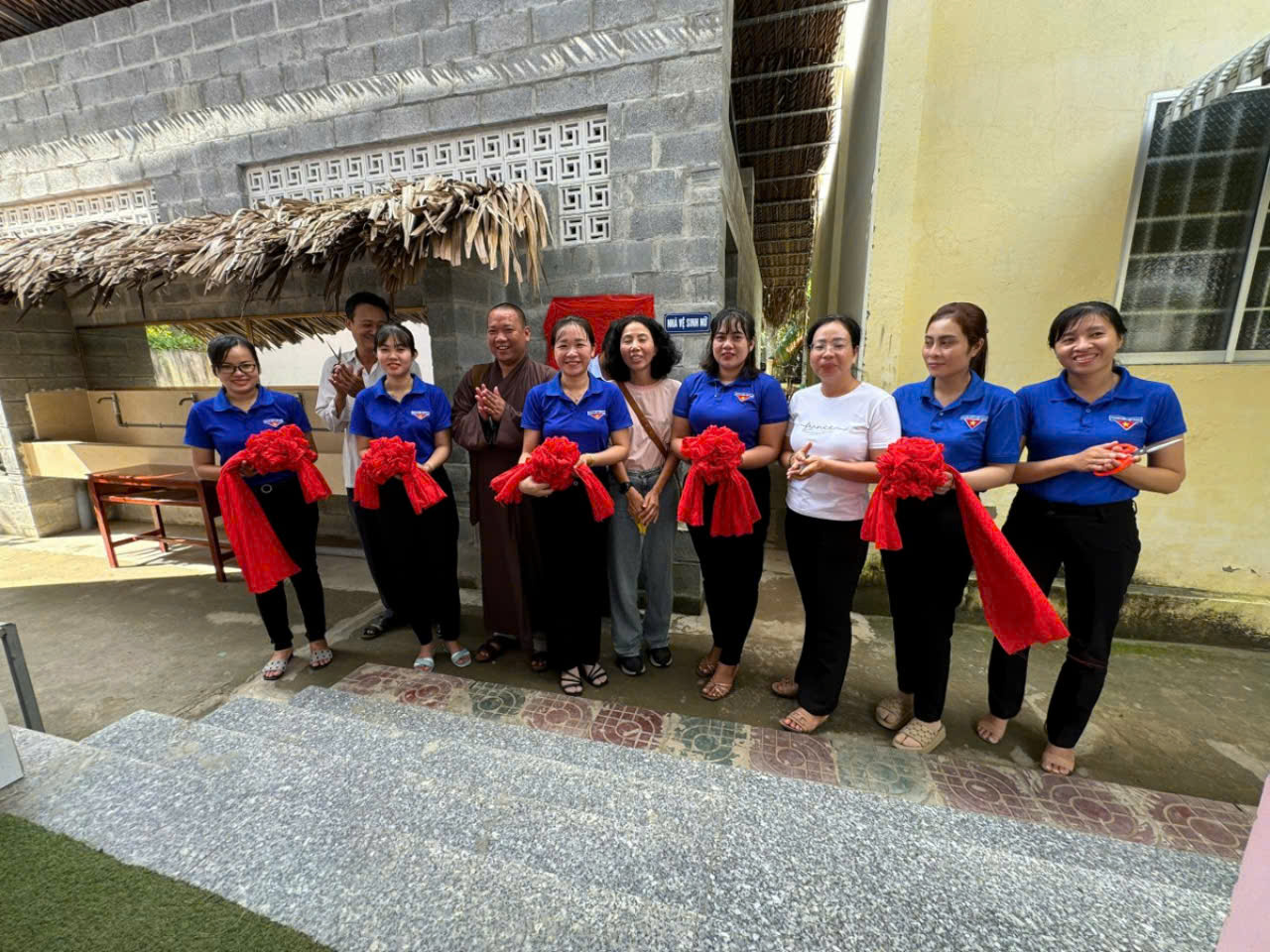 Lãnh đạo tỉnh đoàn (áo trắng từ ảnh nhìn vào bên tay trái), đơn vị tài trợ và lãnh đạo địa phương dự lễ khởi công xây dựng nhà vệ sinh cộng đồng