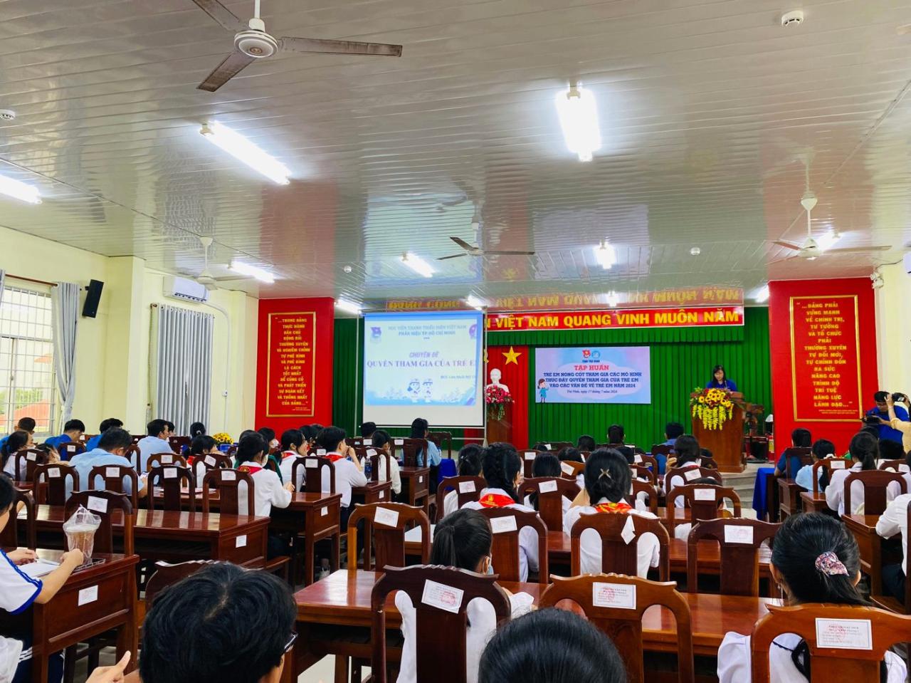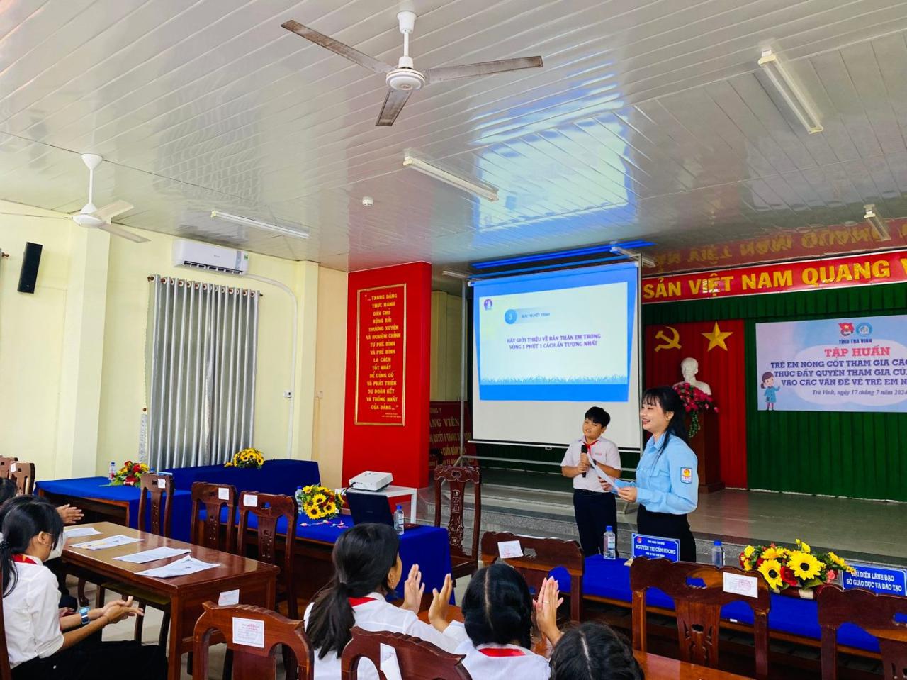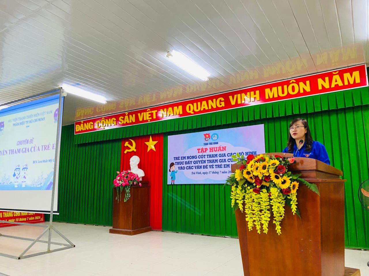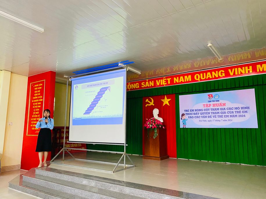 Ngày 17/7/2024, tại Hội trường Ủy ban nhân dân phường 1, thành phố Trà Vinh, Ban Thường vụ Tỉnh đoàn phối hợp Sở Giáo dục và Đào tạo tổ chức lớp lớp tập huấn trẻ em nòng cốt tham gia các mô hình thúc đẩy quyền tham gia của trẻ em vào các vấn đề về trẻ em năm 2024.