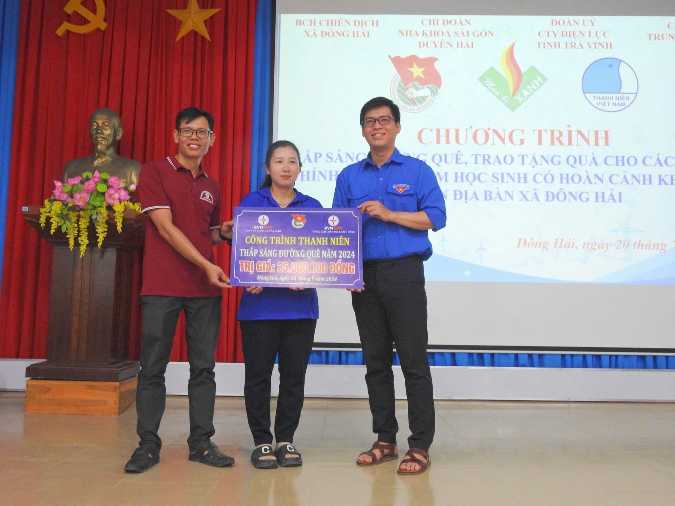 Công trình được thực hiện tại ấp Định An, xã Đông Hải, huyện Duyên Hải với chiều dài hơn 01 km với 16 bộ bóng đèn (đèn chiếc lá) và dây kéo điện. Được biết, đây là tuyến đường khu vực gần chợ có nhiều phương tiện giao thông qua lại thường xuyên. Công trình “Thắp sáng đường quê” được triển khai sẽ giúp bà con thuận tiện hơn trong đi lại, an ninh trật tự cũng đảm bảo. Dịp này, Đoàn cũng đã phối hợp với Trung tâm chăm sóc khách hàng và Nha khoa Sài Gòn trao tặng 22 phần quà cho trẻ em có hoàn cảnh khó khăn và 05 phần quà cho các hộ gia đình chính sách với tổng kinh phí thực hiện 35.000.000 đồng.